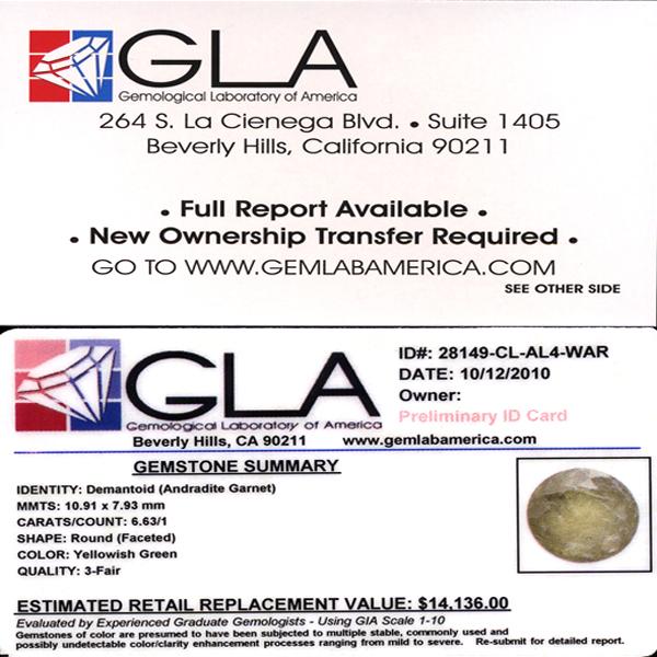 Excellent yellow green colored specimen round cut; lab quality evaluation 3; treatment as noted; Gem Guide wholesale $1989-$3315; full retail appraisal $14136; full lab evaluation available