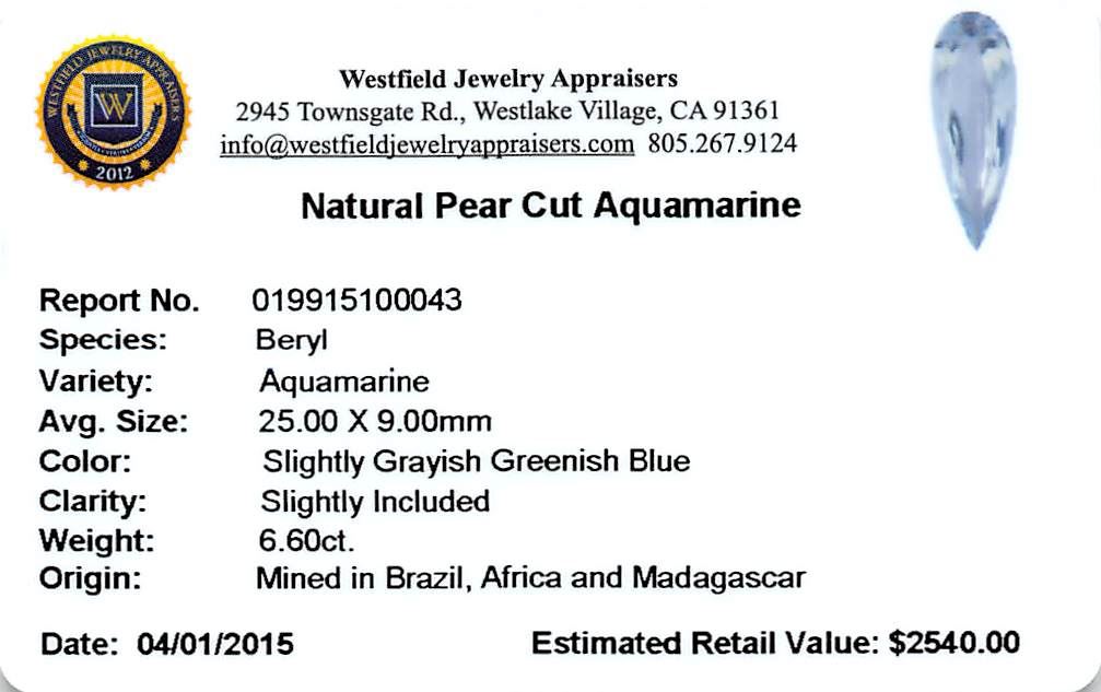 One pear cut natural aquamarine exact weight 6.60ct., clarity is slightly included, type I, medium, very slightly grayish, blue color, (GIA B 5/3), cut is good. Westfield Appraised at $2,540.00.