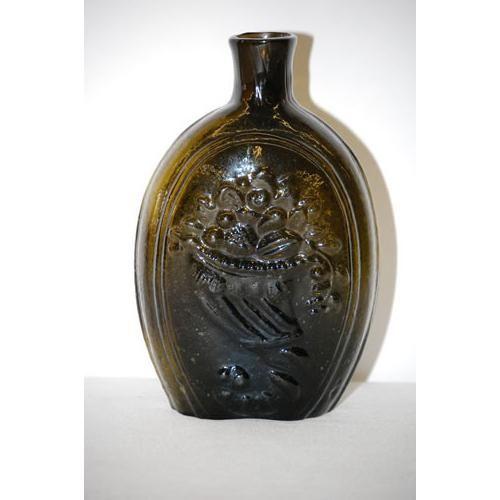 6 7/8" EAGLE-CORNUCOPIA BOTTLE FLASK - OLIVE GREEN W/ SHEARED LIP & OPEN PONTIL (GII-72) - MINOR WEAR