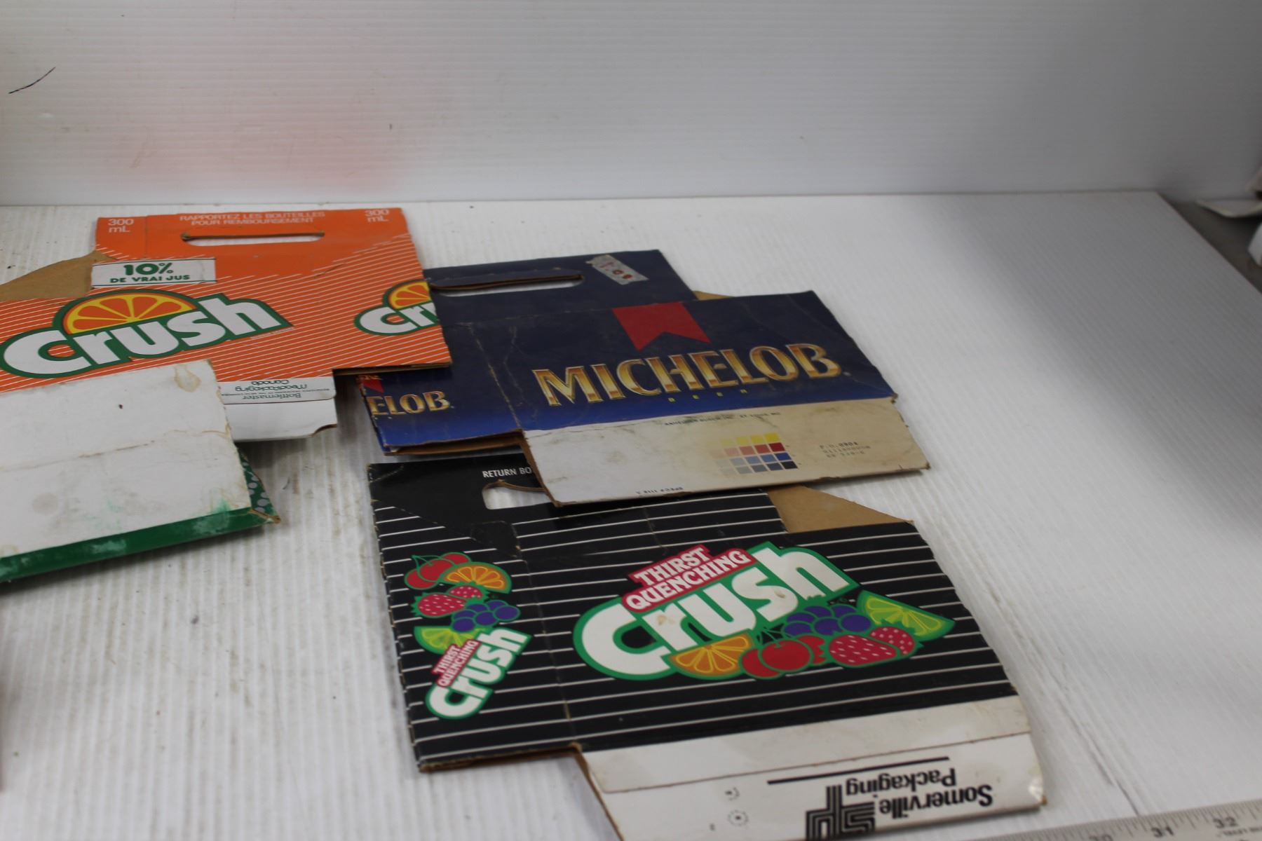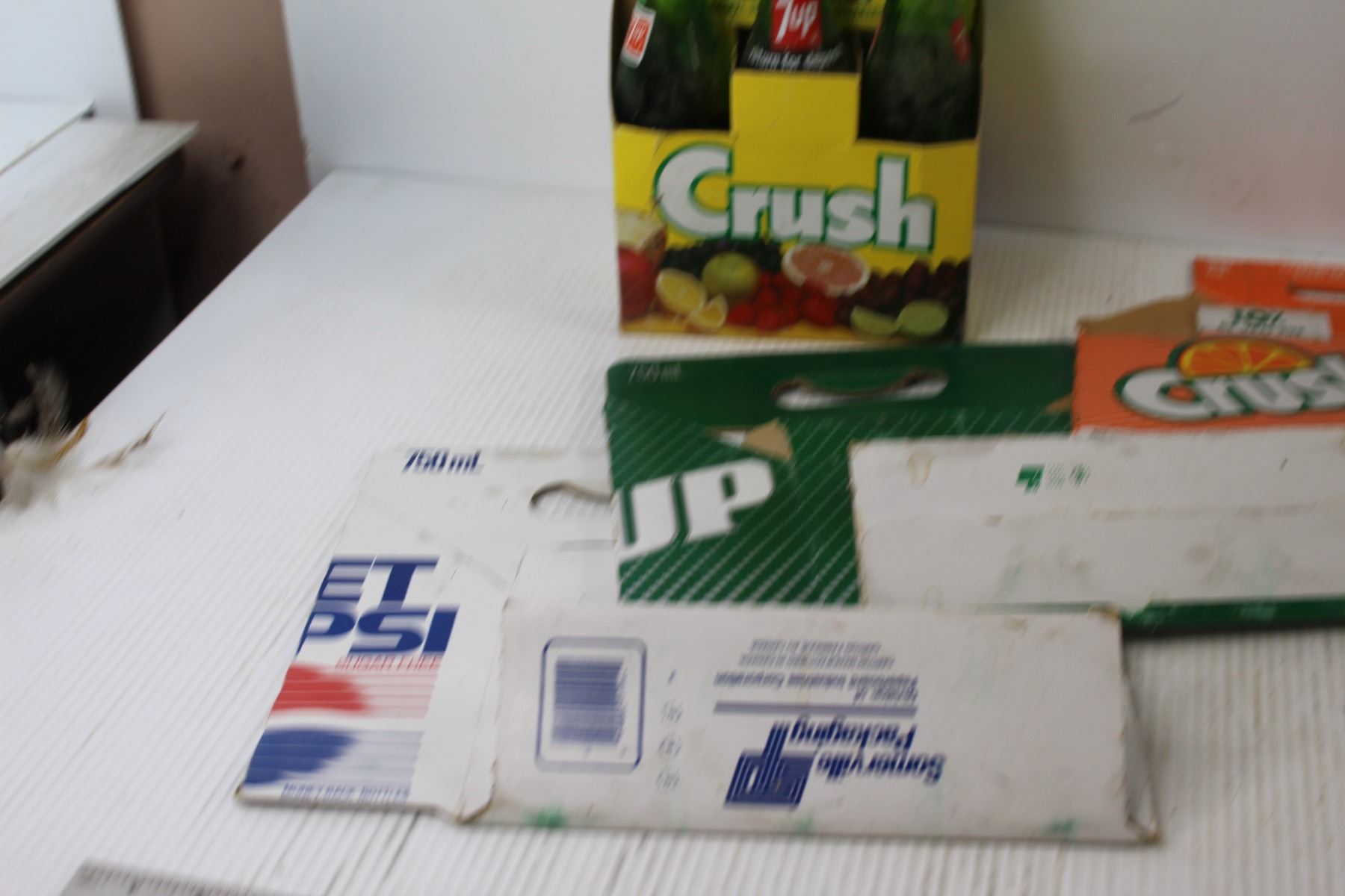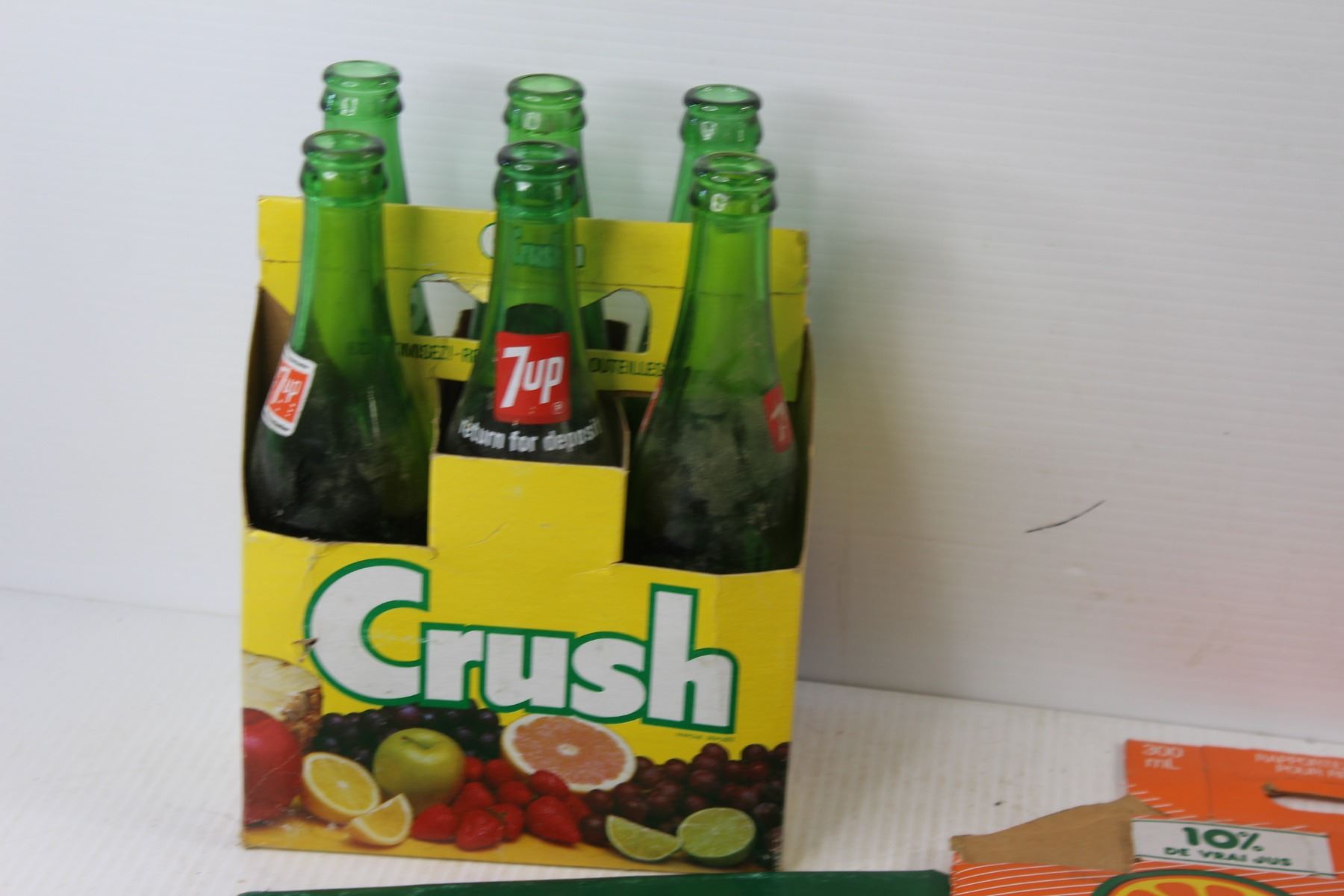 (6) 7-Up Glass Bottles, Assorted Pop Cardboard Boxes