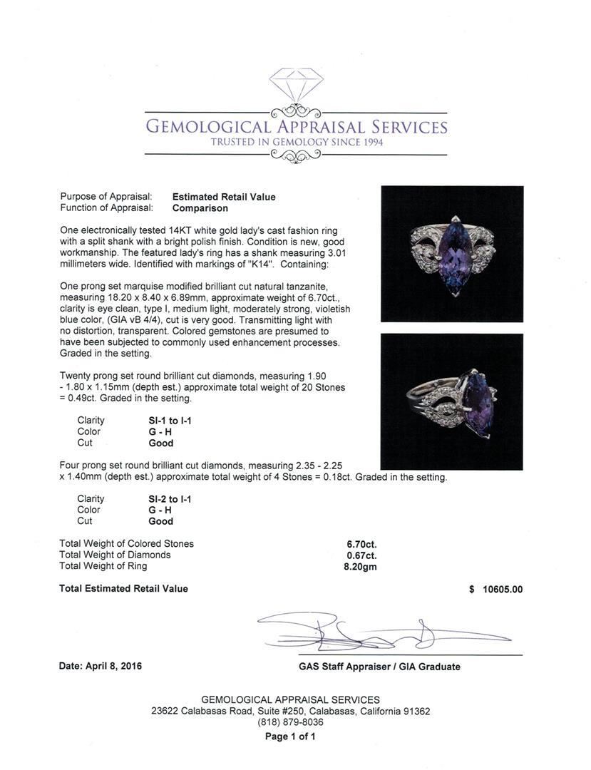 One electronically tested 14KT white gold lady's cast fashion ring with a split shank with a bright polish finish. The featured lady's ring has a shank measuring 3.01 millimeters wide. Identified with markings of "K14". Condition is new, good workmanship. Containing: One prong set marquise modified brilliant cut natural tanzanite, measuring 18.20 x 8.40 x 6.89mm, approximate weight of 6.70ct., clarity is eye clean, type I, medium light, moderately strong, violetish blue color, (GIA vB 4/4), cut is very good. Transmitting light with no distortion, transparent. Colored gemstones are presumed to have been subjected to commonly used enhancement processes. Graded in the setting. Twenty prong set round brilliant cut diamonds, measuring 1.90 - 1.80 x 1.15mm (depth est.) approximate total weight of 20 Stones = 0.49ct. Graded in the setting. Clarity: SI-1 to I-1. Color: G - Good Four prong set round brilliant cut diamonds, measuring 2.35 - 2.25 x 1.40mm (depth est.) approximate total weight of 4 Stones = 0.18ct. Graded in the setting. Clarity: SI-2 to I-1. Color: G - Good. Total Weight of Colored Stones 6.70ct. Total Weight of Diamonds 0.67ct. Total Weight of Ring 8.20gm. GAS Appraised.