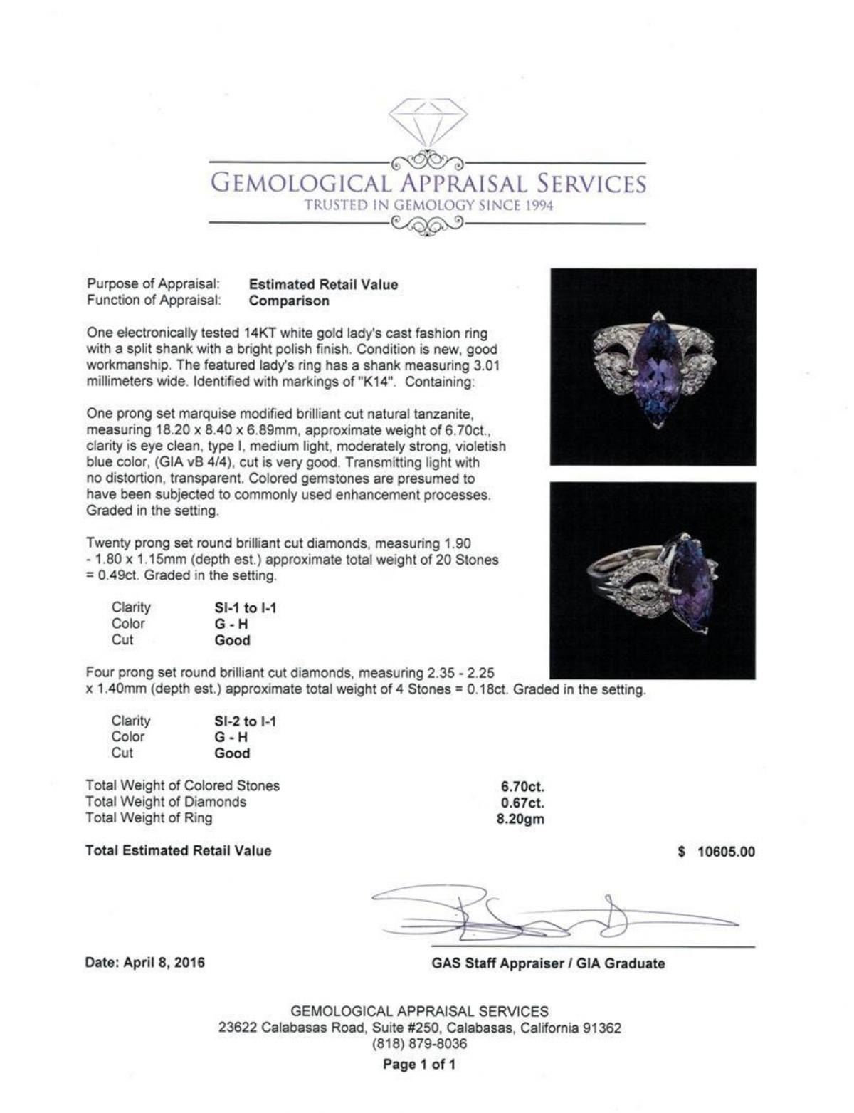 One electronically tested 14KT white gold lady's cast fashion ring with a split shank with a bright polish finish. The featured lady's ring has a shank measuring 3.01 millimeters wide. Identified with markings of "K14". Condition is new, good workmanship. Containing: One prong set marquise modified brilliant cut natural tanzanite, measuring 18.20 x 8.40 x 6.89mm, approximate weight of 6.70ct., clarity is eye clean, type I, medium light, moderately strong, violetish blue color, (GIA vB 4/4), cut is very good. Transmitting light with no distortion, transparent. Colored gemstones are presumed to have been subjected to commonly used enhancement processes. Graded in the setting. Twenty prong set round brilliant cut diamonds, measuring 1.90 - 1.80 x 1.15mm (depth est.) approximate total weight of 20 Stones = 0.49ct. Graded in the setting. Clarity: SI-1 to I-1. Color: G -  Good Four prong set round brilliant cut diamonds, measuring 2.35 - 2.25 x 1.40mm (depth est.) approximate total weight of 4 Stones = 0.18ct. Graded in the setting. Clarity: SI-2 to I-1. Color: G -  Good. Total Weight of Colored Stones 6.70ct. Total Weight of Diamonds 0.67ct. Total Weight of Ring 8.20gm. GAS Appraised.