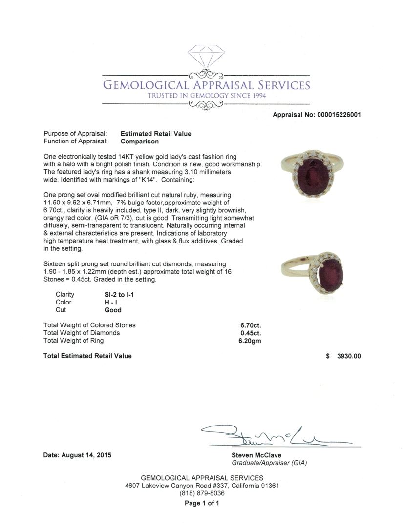 One electronically tested 14KT yellow gold lady's cast fashion ring with a halo with a bright polish finish. The featured lady's ring has a shank measuring 3.10 millimeters wide. Identified with markings of "K14". Condition is new, good workmanship. Containing: One prong set oval modified brilliant cut natural ruby, measuring 11.50 x 9.62 x 6.71mm, 7% bulge factor, approximate weight of 6.70ct., clarity is heavily included, type II, dark, very slightly brownish, orangy red color, (GIA oR 7/3), cut is good. Transmitting light somewhat diffusely, semi-transparent to translucent. Naturally occurring internal & external characteristics are present. Indications of laboratory high temperature heat treatment, with glass & flux additives. Graded in the setting. Sixteen split prong set round brilliant cut diamonds, measuring 1.90 - 1.85 x 1.22mm (depth est.) approximate total weight of 16 Stones = 0.45ct. Graded in the setting. Clarity: SI-2 to I-1. Color: H - I. Cut Good. Total Weight of Colored Stones 6.70ct. Total Weight of Diamonds 0.45ct. Total Weight of Ring 6.20gm. GAS Appraised at $3,930.00.