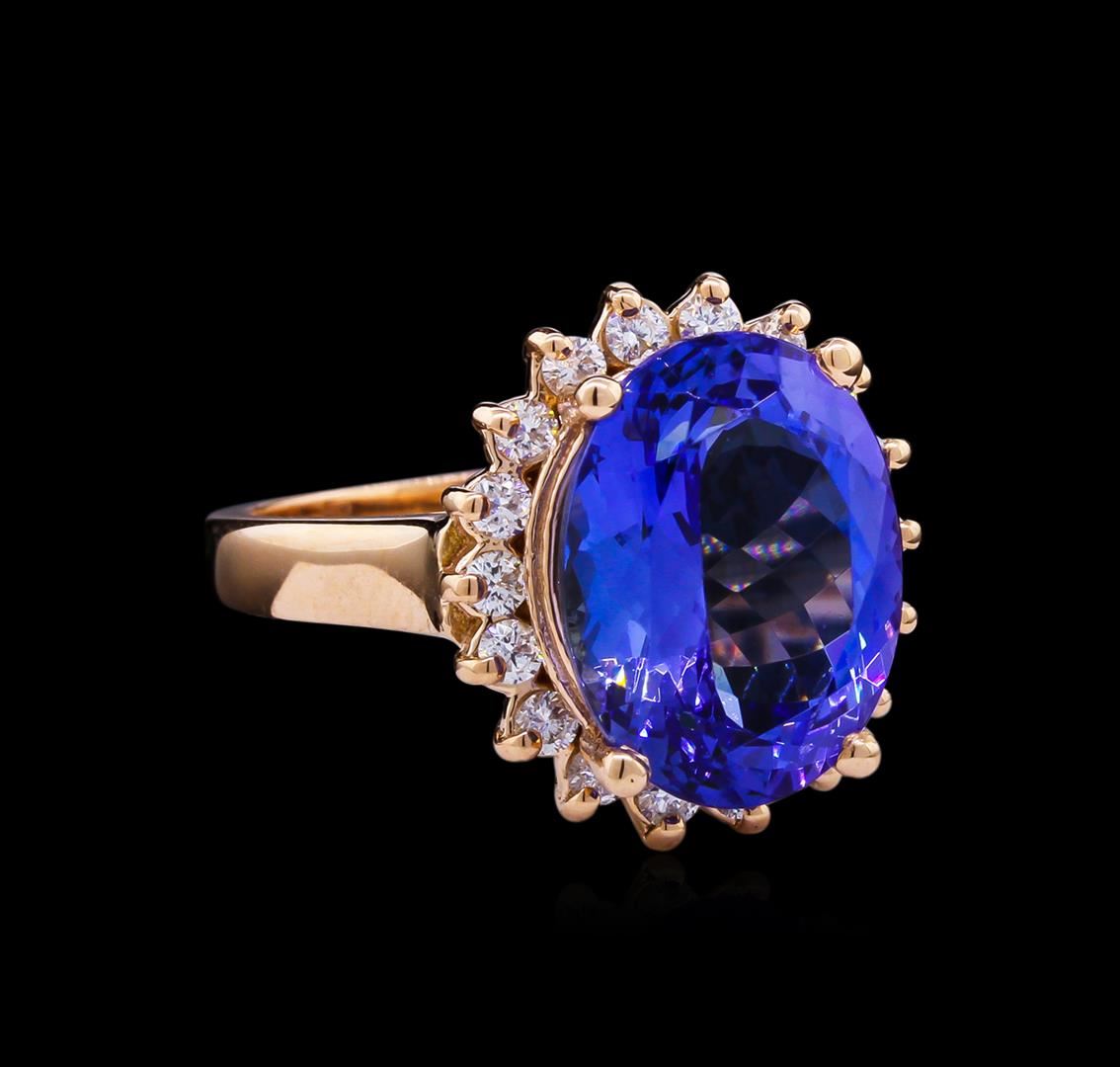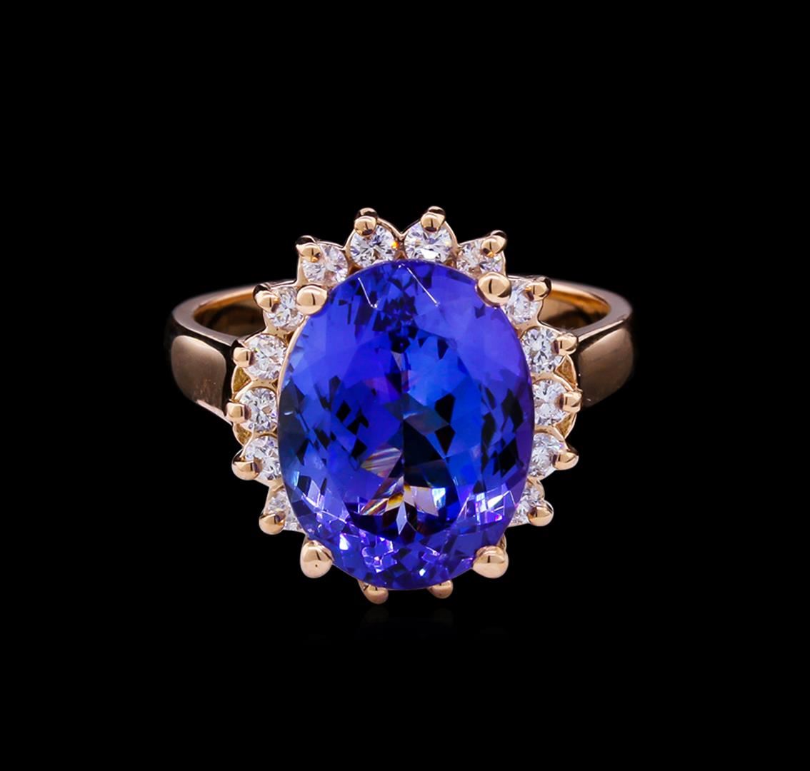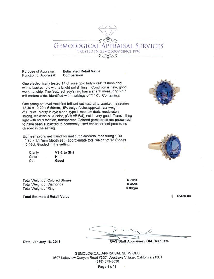 One electronically tested 14KT rose gold lady's cast fashion ring with a basket halo with a bright polish finish. The featured lady's ring has a shank measuring 2.27 millimeters wide. Identified with markings of "14K". Condition is new, good workmanship. Containing: One prong set oval modified brilliant cut natural tanzanite, measuring 13.40 x 10.20 x 6.59mm, 5%. bulge factor, approximate weight of 6.70ct., clarity is eye clean, type I, medium dark, moderately strong, violetish blue color, (GIA vB 6/4), cut is very good. Transmitting light with no distortion, transparent. Colored gemstones are presumed to have been subjected to commonly used enhancement processes. Graded in the setting. Eighteen prong set round brilliant cut diamonds, measuring 1.90 - 1.80 x 1.17mm (depth est.) approximate total weight of 18 Stones = 0.45ct. Graded in the setting. Clarity: VS-2 to SI-2. Color: H - I. Cut Good. Total Weight of Colored Stones 6.70ct. Total Weight of Diamonds 0.45ct. Total Weight of Ring 6.80gm. GAS Appraised at $13,430.00.