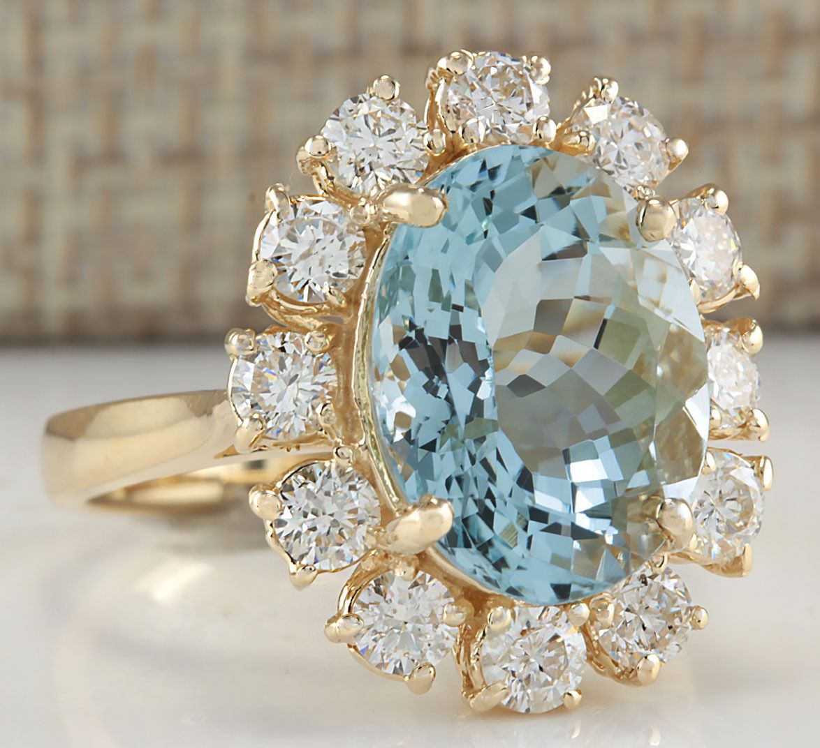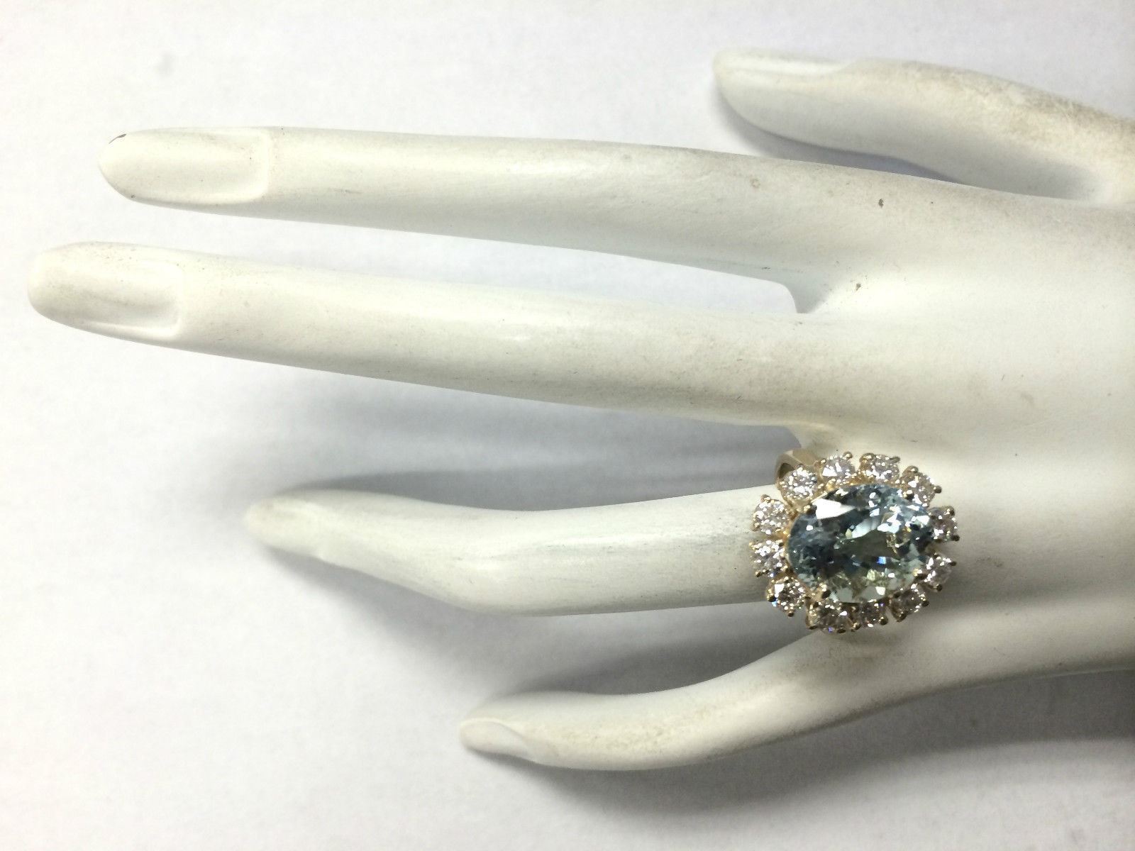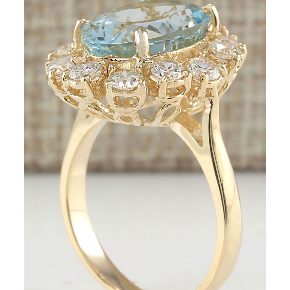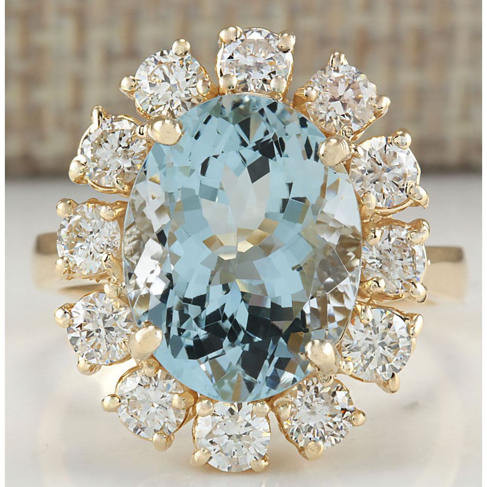 6.71 CTW Natural Aquamarine And Diamond Ring 18K Solid Yellow Gold