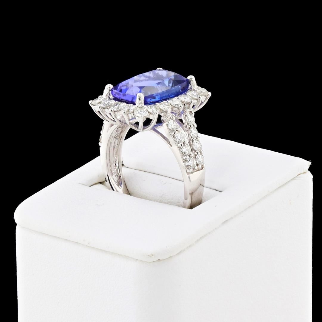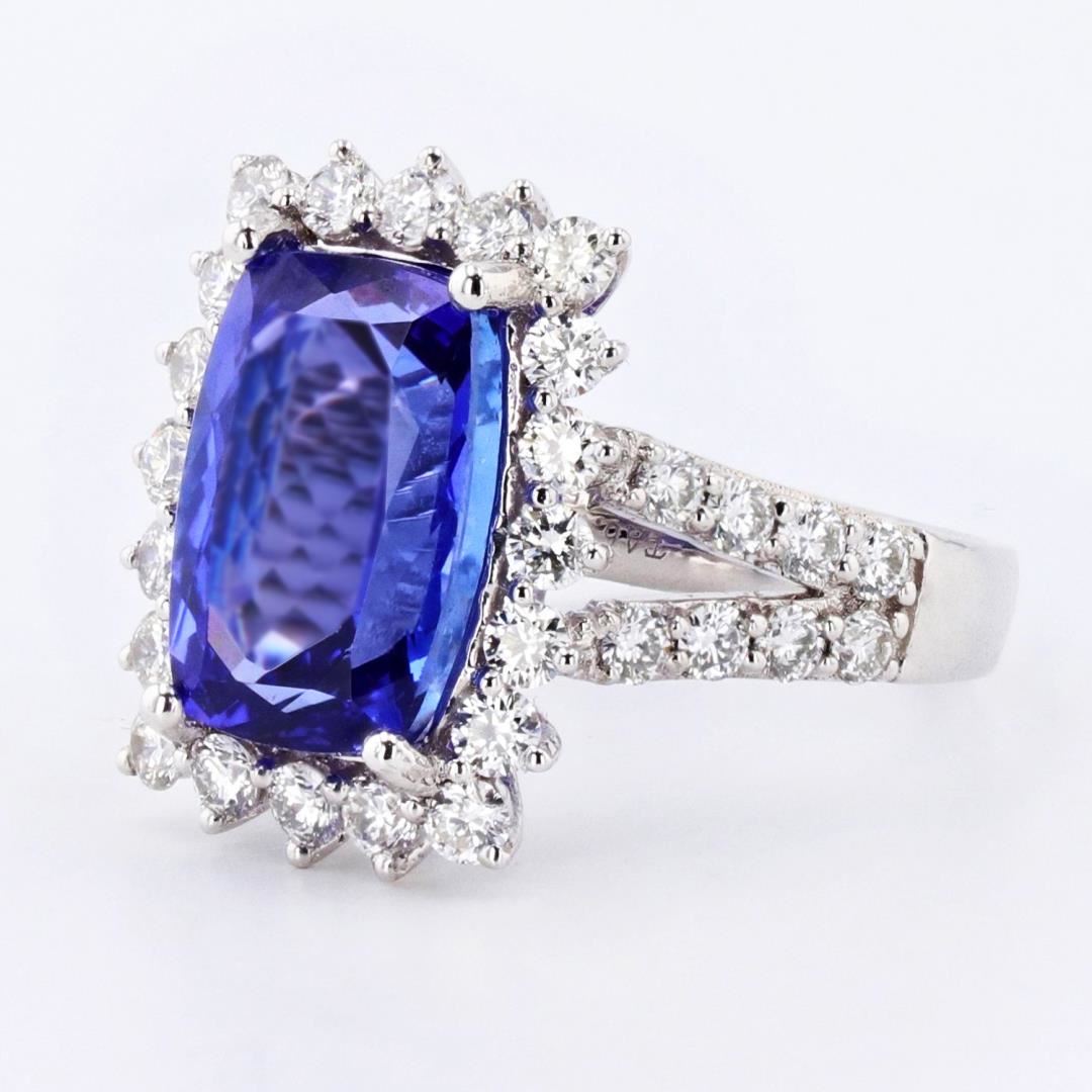 One electronically tested platinum ladies cast tanzanite and diamond ring with a bright polish finish. Condition is new, good workmanship. The featured tanzanite is set within a diamond floret bezel supported by diamond set shoulders, completed by a three millimeter wide band. Trademark is Orianne. Identified with markings of "PT950". Containing: One prong set cushion modified brilliant cut natural tanzanite, measuring 12.85 x 8.76 x 6.57mm, exact weight 6.71ct., clarity is eye clean, type I, dark, very slightly grayish, violetish blue color, (GIA vB 7/3), cut is good. Transmitting light with no distortion, transparent. GIA Gemological Report attached. Graded loose prior to setting in the GIA Laboratory, Report #5171379335. Tanzanite is a very rare gemstone that is only found in the country of Tanzania. Originally discovered in 1967. Tiffany & Company, named the stone Tanzanite. It is found in the Usumburu Mountains that border the Umba Valley of northern Tanzania. Tanzanite occurs in gray, brown, violet, blue, reddish-purple, & green. The gem is interesting because of its exceptional pleochroism. Rotated in different directions a tanzanite will exhibit multiple changes of color. Tanzanite has a low tolerance to ultrasonic cleaning, and should not be cleaned using this method. Thirty-six prong set round brilliant cut diamonds approximate total weight of 36 Stones = 1.45ctw. Graded in the setting. Color F - H Clarity VS1 to VS2 Total Weight of Colored Stones 6.71ct. Total Weight of Diamonds 1.45ctw. Total Weight of Ring 9.75 gm Size: 7 1/4