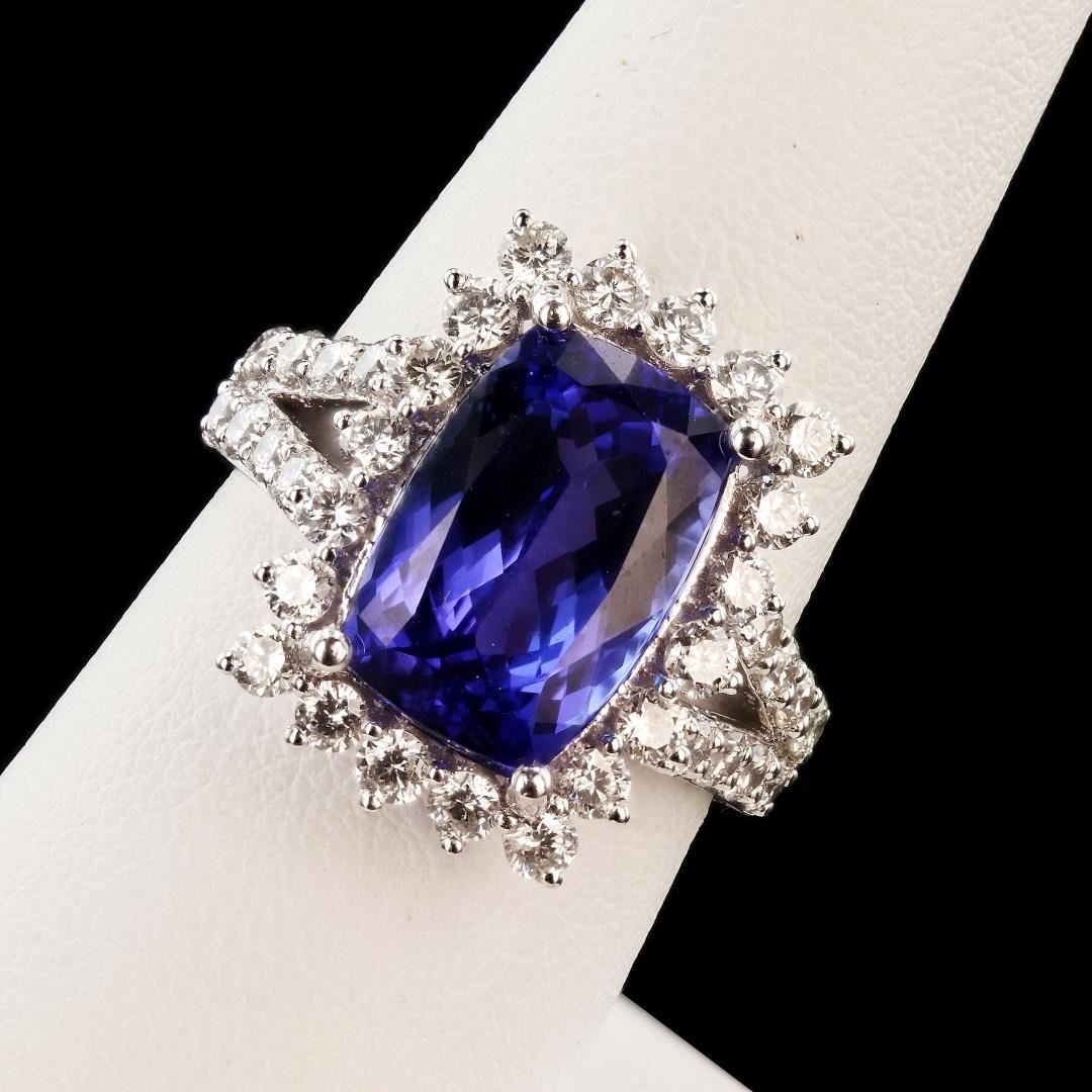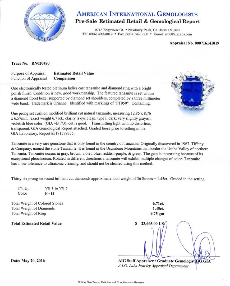 One electronically tested platinum ladies cast tanzanite and diamond ring with a bright polish finish. Condition is new, good workmanship. The featured tanzanite is set within a diamond floret bezel supported by diamond set shoulders, completed by a three millimeter wide band. Trademark is Orianne. Identified with markings of "PT950". Containing: One prong set cushion modified brilliant cut natural tanzanite, measuring 12.85 x 8.76 x 6.57mm, exact weight 6.71ct., clarity is eye clean, type I, dark, very slightly grayish, violetish blue color, (GIA vB 7/3), cut is good. Transmitting light with no distortion, transparent. GIA Gemological Report attached. Graded loose prior to setting in the GIA Laboratory, Report #5171379335. Tanzanite is a very rare gemstone that is only found in the country of Tanzania. Originally discovered in 1967. Tiffany & Company, named the stone Tanzanite. It is found in the Usumburu Mountains that border the Umba Valley of northern Tanzania. Tanzanite occurs in gray, brown, violet, blue, reddish-purple, & green. The gem is interesting because of its exceptional pleochroism. Rotated in different directions a tanzanite will exhibit multiple changes of color. Tanzanite has a low tolerance to ultrasonic cleaning, and should not be cleaned using this method. Thirty-six prong set round brilliant cut diamonds approximate total weight of 36 Stones = 1.45ctw. Graded in the setting. Color F - H Clarity VS1 to VS2 Total Weight of Colored Stones 6.71ct. Total Weight of Diamonds 1.45ctw. Total Weight of Ring 9.75 gm Size: 7 1/4