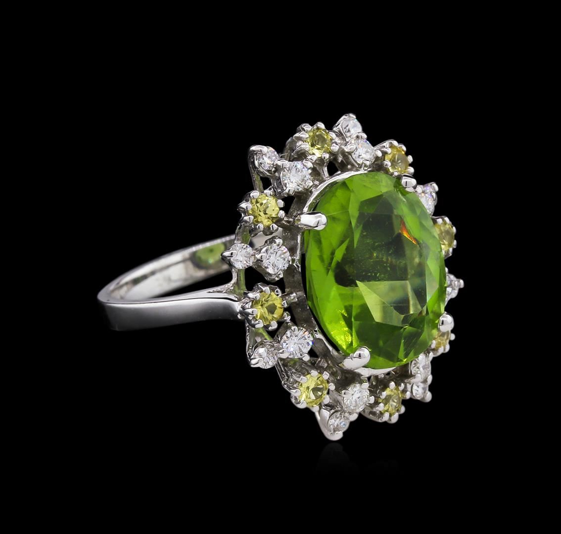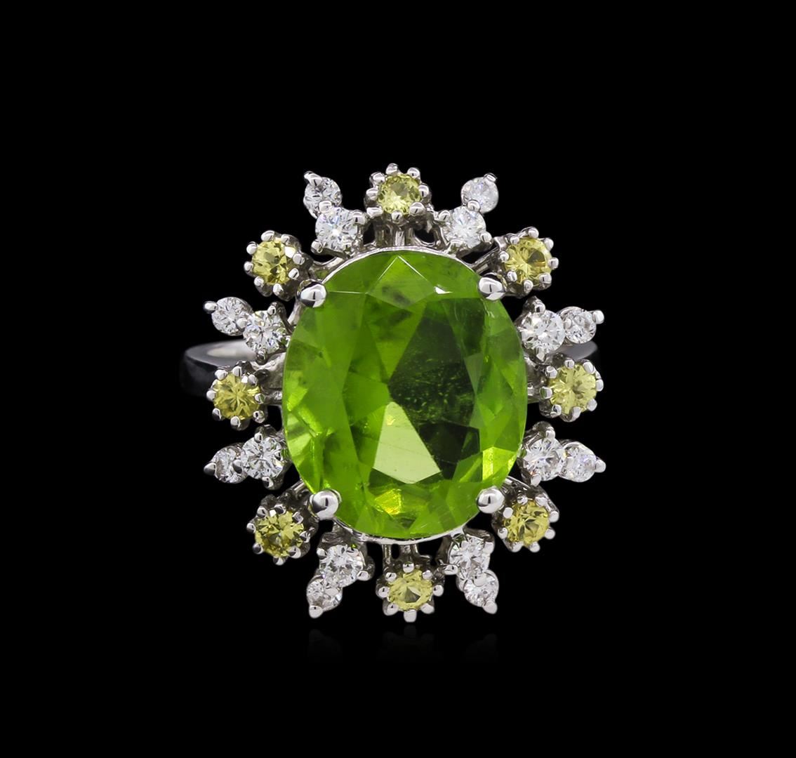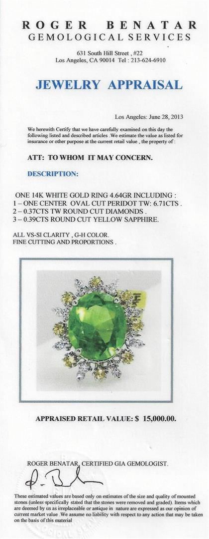 One 14KT White Gold ring 4.64GR Including: one center oval cut peridot TW: 6.71CTS. 0.37CTS TW Round Cut Diamonds. 0.39CTS Round Cut Yellow Sapphire. All VS-SI Clarity, G-H Color Fine Cutting and Proportions. RBGS Appraised at $15,000.00.