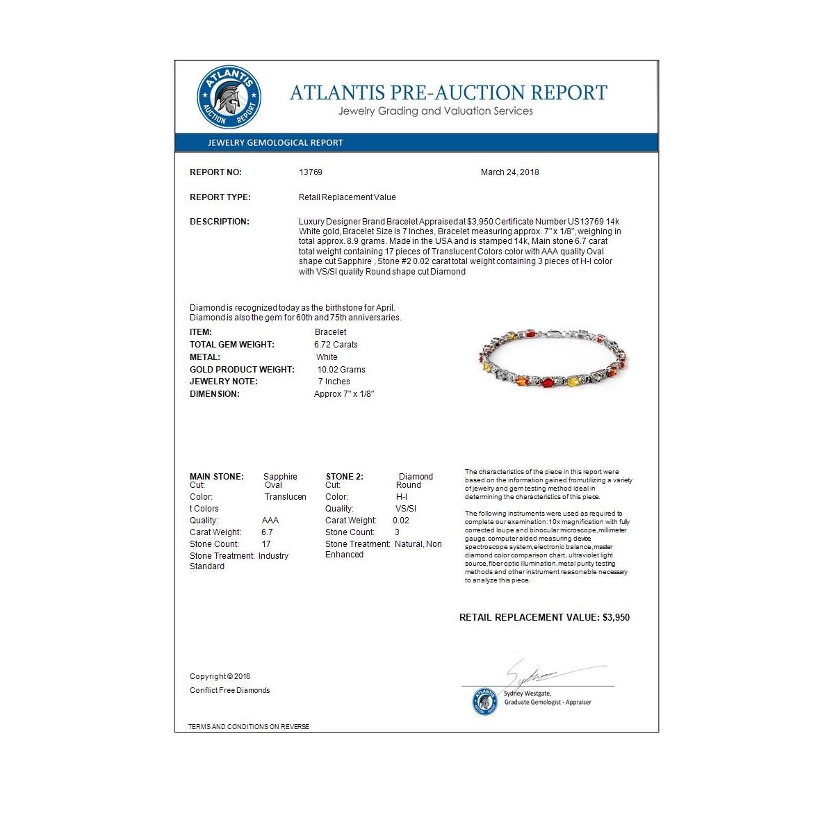 REF-60A2X -13769 ---- 6.72 CTW Multi-Sapphire & Diamond Bracelet 14K White Gold ---- Luxury Designer Brand Bracelet Appraised at $3,950 Certificate Number US13769 14k White gold, Bracelet Size is 7 Inches, Bracelet measuring approx. 7" x 1/8", weighing in total approx. 8.9 grams. Made in the USA and is stamped 14k, Main stone 6.7 carat total weight containing 17 pieces of Translucent Colors color with AAA quality Oval shape cut Sapphire , Stone #2 0.02 carat total weight containing 3 pieces of H-I color with VS/SI quality Round shape cut Diamond