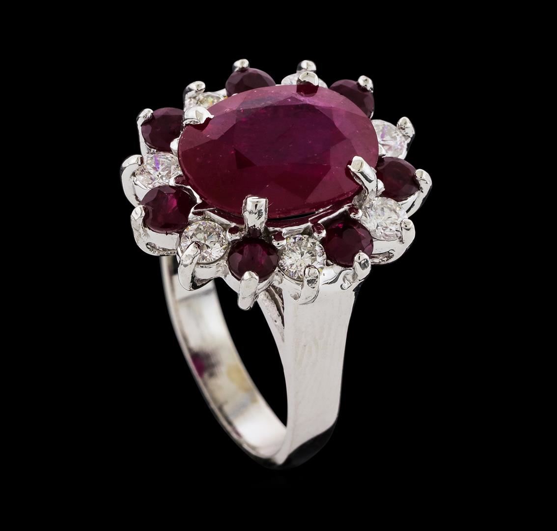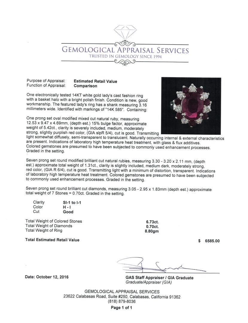 One electronically tested 14KT white gold lady's cast fashion ring with a basket halo with a bright polish finish. The featured lady's ring has a shank measuring 3.16 millimeters wide. Identified with markings of '14K 585'. Condition is new, good workmanship. Containing: One prong set oval modified mixed cut natural ruby, measuring 12.53 x 9.47 x 4.69mm, (depth est.) 15%. bulge factor, approximate weight of 5.42ct., clarity is severely included, medium, moderately strong, slightly purplish red color, (GIA slpR 5/4), cut is good. Transmitting light somewhat diffusely, semi-transparent to translucent. Naturally occurring internal & external characteristics are present. Indications of laboratory high temperature heat treatment, with glass & flux additives. Colored gemstones are presumed to have been subjected to commonly used enhancement processes. Graded in the setting. Seven prong set round modified brilliant cut natural rubies, measuring 3.30 - 3.20 x 2.11 mm, (depth est.) approximate total weight of 1.31ct., clarity is slightly included, medium dark, moderately strong, red color, (GIA R 6/4), cut is good. Transmitting light with a minimum of distortion, transparent. Indications of laboratory high temperature heat treatment. Colored gemstones are presumed to have been subjected to commonly used enhancement processes. Graded in the setting. Seven prong set round brilliant cut diamonds, measuring 3.05 - 2.95 x 1.83mm (depth est.) approximate total weight of 7 Stones = 0.70ct. Graded in the setting. Clarity SI-1 to I-1. Color: H - I Cut Good. Total Weight of Colored Stones 6.73ct.. Total Weight of Diamonds 0.70ct.. Total Weight of Ring 8.80gm. GAS Appraised at $6,585.00.