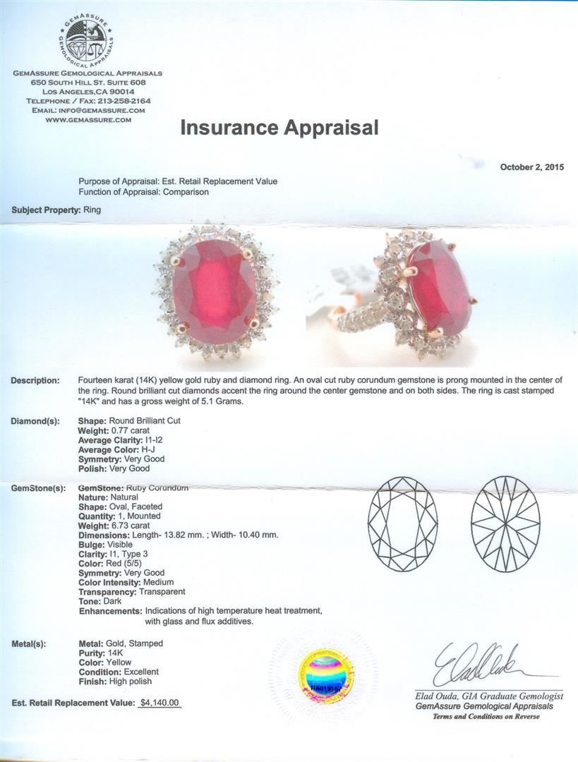 Fourteen karat (14K) yellow gold ruby and diamond ring. An oval cut ruby corundum gemstone is prong mounted in the center of the ring. Round brilliant cut diamonds accent the ring around the center gemstone and on both sides. The ring is cast stamped "14K" and has a gross weight of 5.1 grams. Diamond(s): Shape: Round brilliant cut. Weight: 0.77 carat. Average clarity: I1-I2. Average color: H-J. Symmetry: Very good. Polish: Very good. Gemstone(s): Gemstone: Ruby corundum. Nature: Natural. Shape: Oval, faceted. Quantity: 1, mounted. Weight: 6.73 carat. Dimensions: Length-13.82 mm. ; Width-10.40 mm. Bulge: Visible. Clarity: I1, type 3. Color: Red (5/5). Symmetry: Very Good. Color intensity: Medium. Transparent: Transparent. Tone: Dark. Enhancements: Indications of high temperature heat treatment, with glass and flux additives. Metal(s): Metal: Gold, stamped. Purity: 14K. Color: Yellow. Condition: Excellent. Finish: High polish. GGA Appraised at $4,140.00.