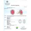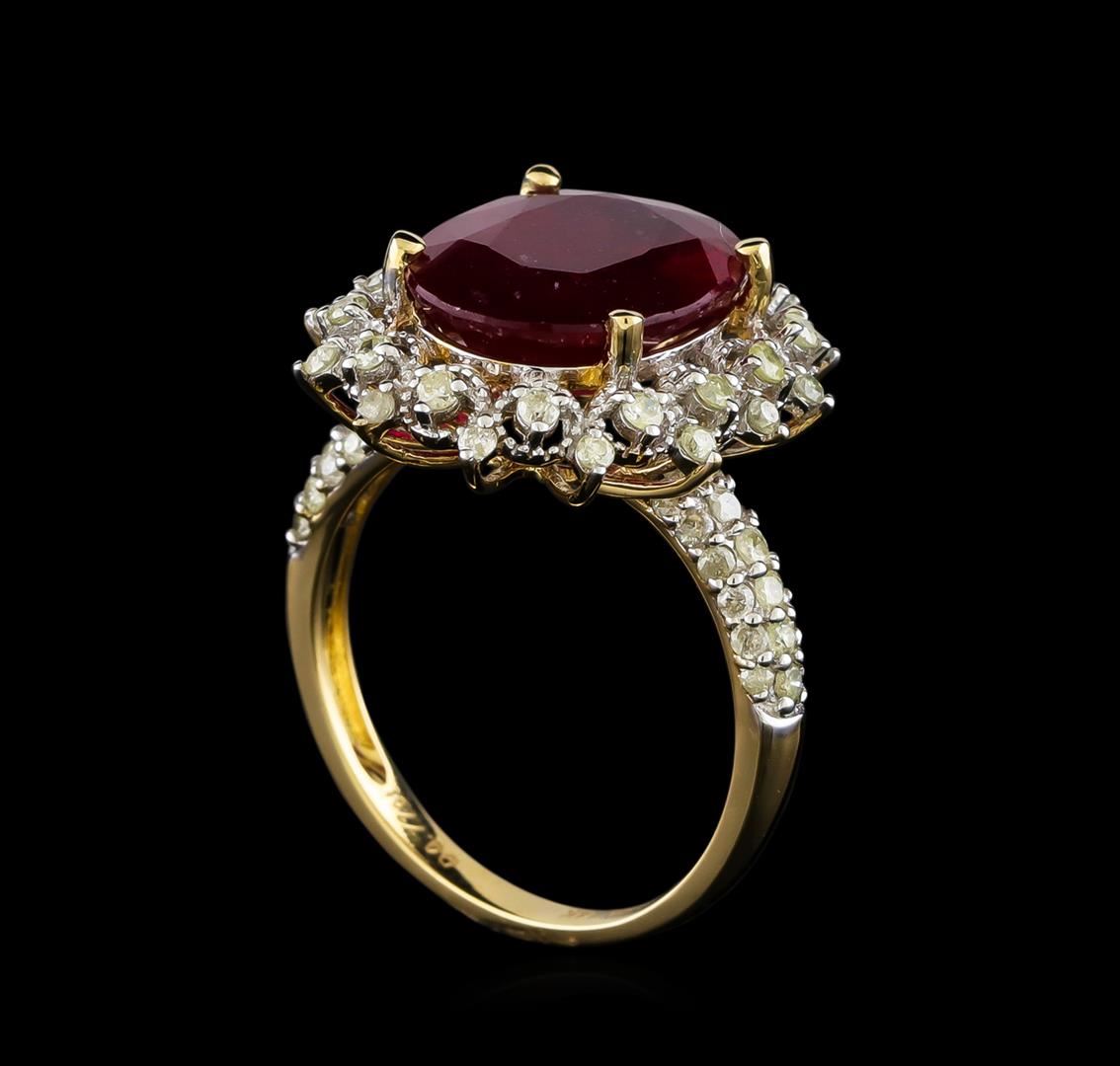 Fourteen karat (14K) yellow gold ruby and diamond ring. An oval cut ruby corundum gemstone is prong mounted in the center of the ring. Round brilliant cut diamonds accent the ring around the center gemstone and on both sides. The ring is cast stamped "14K" and has a gross weight of 5.1 grams. Diamond(s): Shape: Round brilliant cut. Weight: 0.77 carat. Average clarity: I1-I2. Average color: H-J. Symmetry: Very good. Polish: Very good. Gemstone(s): Gemstone: Ruby corundum. Nature: Natural. Shape: Oval, faceted. Quantity: 1, mounted. Weight: 6.73 carat. Dimensions: Length-13.82 mm. ; Width-10.40 mm. Bulge: Visible. Clarity: I1, type 3. Color: Red (5/5). Symmetry: Very Good. Color intensity: Medium. Transparent: Transparent. Tone: Dark. Enhancements: Indications of high temperature heat treatment, with glass and flux additives. Metal(s): Metal: Gold, stamped. Purity: 14K. Color: Yellow. Condition: Excellent. Finish: High polish. GGA Appraised at $4,140.00.