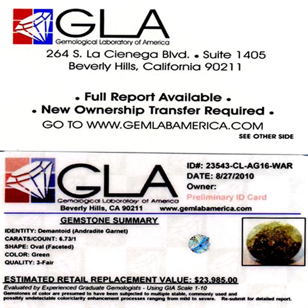 Excellent green colored specimen oval cut; lab quality evaluation 3; treatment as noted; Gem Guide wholesale $3365-$5048; full retail appraisal $23985; full lab evaluation available
