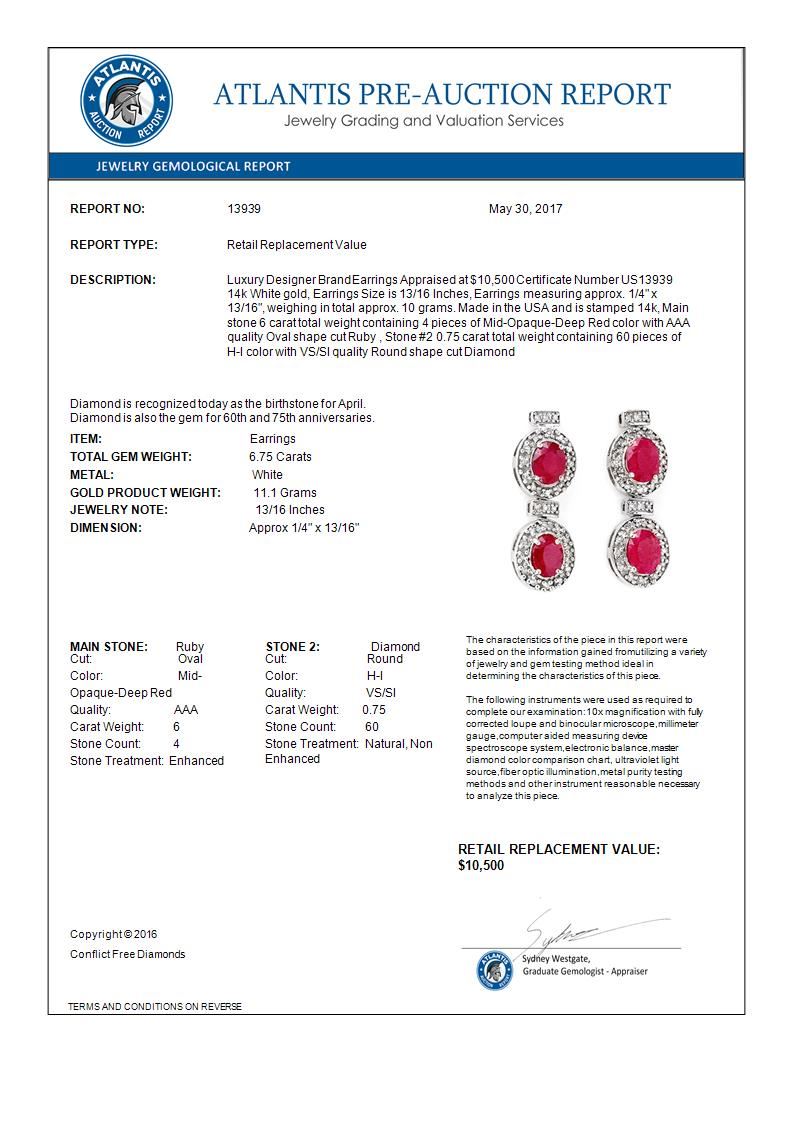 6.75 CTW Ruby & Diamond Earrings 14K White Gold ---- Luxury Designer Brand Earrings Appraised Retail Price at $10,500 ---- SKU Number US13939 14k White gold Earrings Size is 13/16 Inches, Earrings measuring approx. 1/4" x 13/16", weighing in total approx. 10 grams. Made in the USA and is stamped 14k, Main stone 6 carat total weight containing 4 pieces of Mid-Opaque-Deep Red color with AAA quality Oval shape cut Ruby , Stone #2 0.75 carat total weight containing 60 pieces of H-I color with VS/SI quality Round shape cut