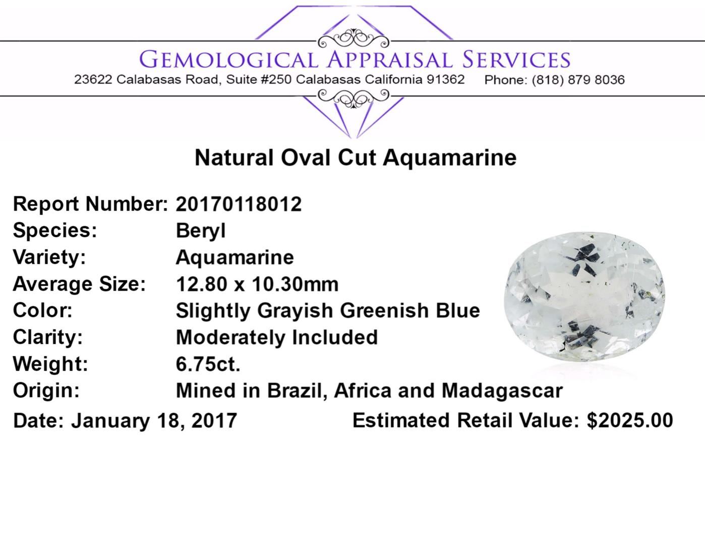 One natural oval cut aquamarine with an exact weight of 6.75ct., clarity is moderately included, slightly grayish greenish blue. Gemological Appraisals Services estimates the retail value at $2025 GAS Appraised.