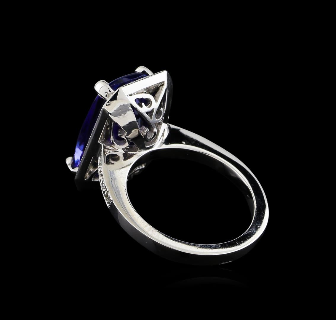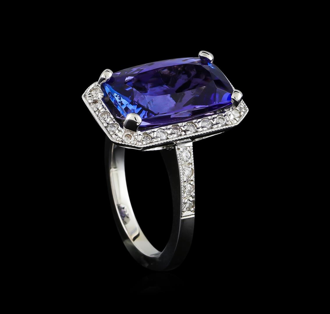 One electronically tested 14KT white gold ladies cast tanzanite and diamond ring. The featured tanzanite is set within a diamond bezel supported by an elaborate lattice under gallery and diamond set shoulders, completed by a two millimeter wide band. Bright polish finish with milgrain detailing. Identified with markings of "14K". Condition is new, good workmanship. Containing: One prong set rectangular cushion mixed cut natural tanzanite, measuring 14.70 x 9.25 x 6.30mm, approximate weight of 6.75ct., clarity is eye clean, type I, medium dark, very slightly grayish, bluish violet color, (GIA bV 6/3), cut is good. Transmitting light with no distortion, transparent. Colored Stone Grading Report attached. Graded in the setting. Tanzanite is a very rare gemstone that is only found in the country of Tanzania. Originally discovered in 1967. Tiffany & Company, named the stone Tanzanite. It is found in the Usumburu Mountains that border the Umba Valley of northern Tanzania. Tanzanite occurs in gray, brown, violet, blue, reddish-purple, & green. The gem is interesting because of its exceptional pleochroism. Rotated in different directions a tanzanite will exhibit multiple changes of color. Tanzanite has a low tolerance to ultrasonic cleaning, and should not be cleaned using this method. Thirty prong set round brilliant cut diamonds, measuring 1.50 - 1.50 x 0.90mm (depth est.) approximate total weight of 30 Stones = 0.37ct. Graded in the setting. Clarity: SI-2 to I-2. Color: G - I. Total Weight of Colored Stones 6.75ct. Total Weight of Diamonds 0.37ct. Total Weight of Ring 7.71gm. AIG Appraised at $16,670.00.