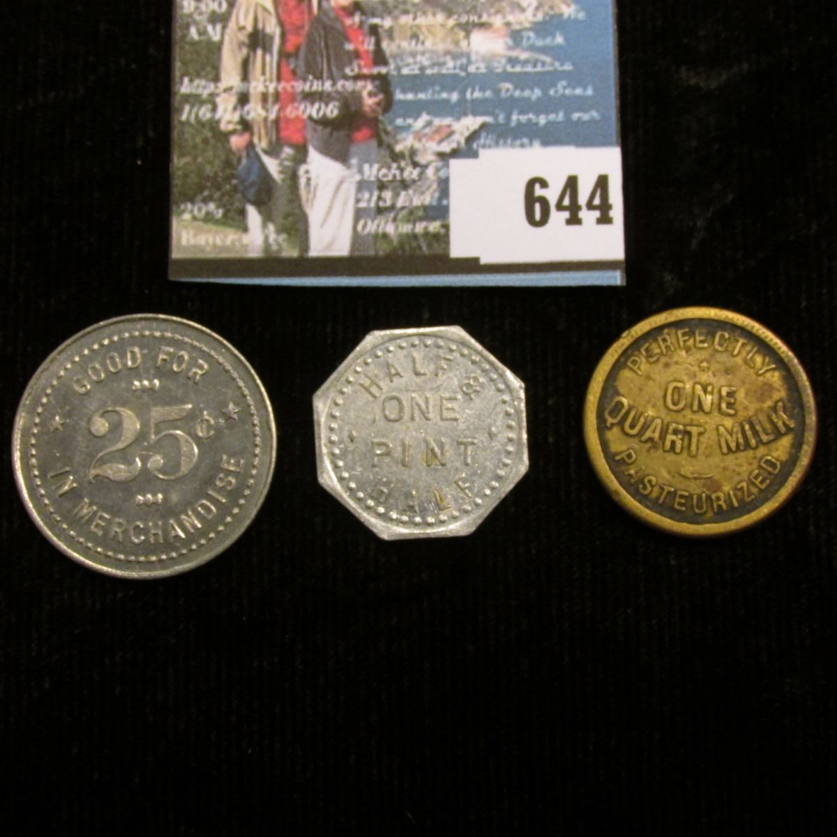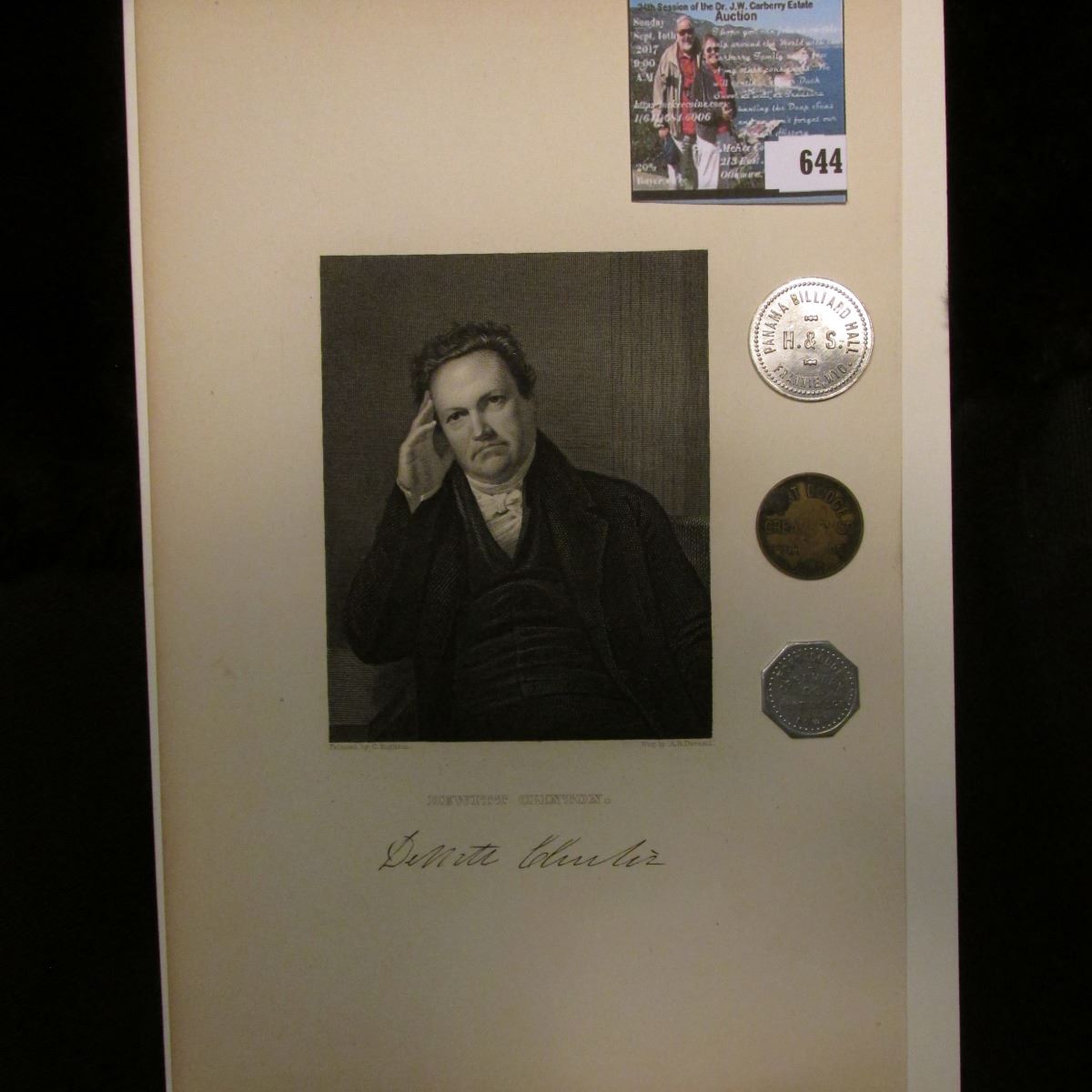 6.75" x 10 3/8" Steel Engraving of Dewitt Clinton, (March 2, 1769 – February 11, 1828) was an American politician and naturalist who served as a United States Senator, Mayor of New York City; "Good For/25c/In Merchandise", "Panama Billiard Hall/H & S/Frannie, Wyo."; "Half &/One/Pint/Half", "Fort Dodge/Creamery/Co./Fort Dodge/Iowa"; "Perfectly/Pateurized/One/Quart Milk", "Fort Dodge/Creamery Co./Fort Dodge,/Iowa".