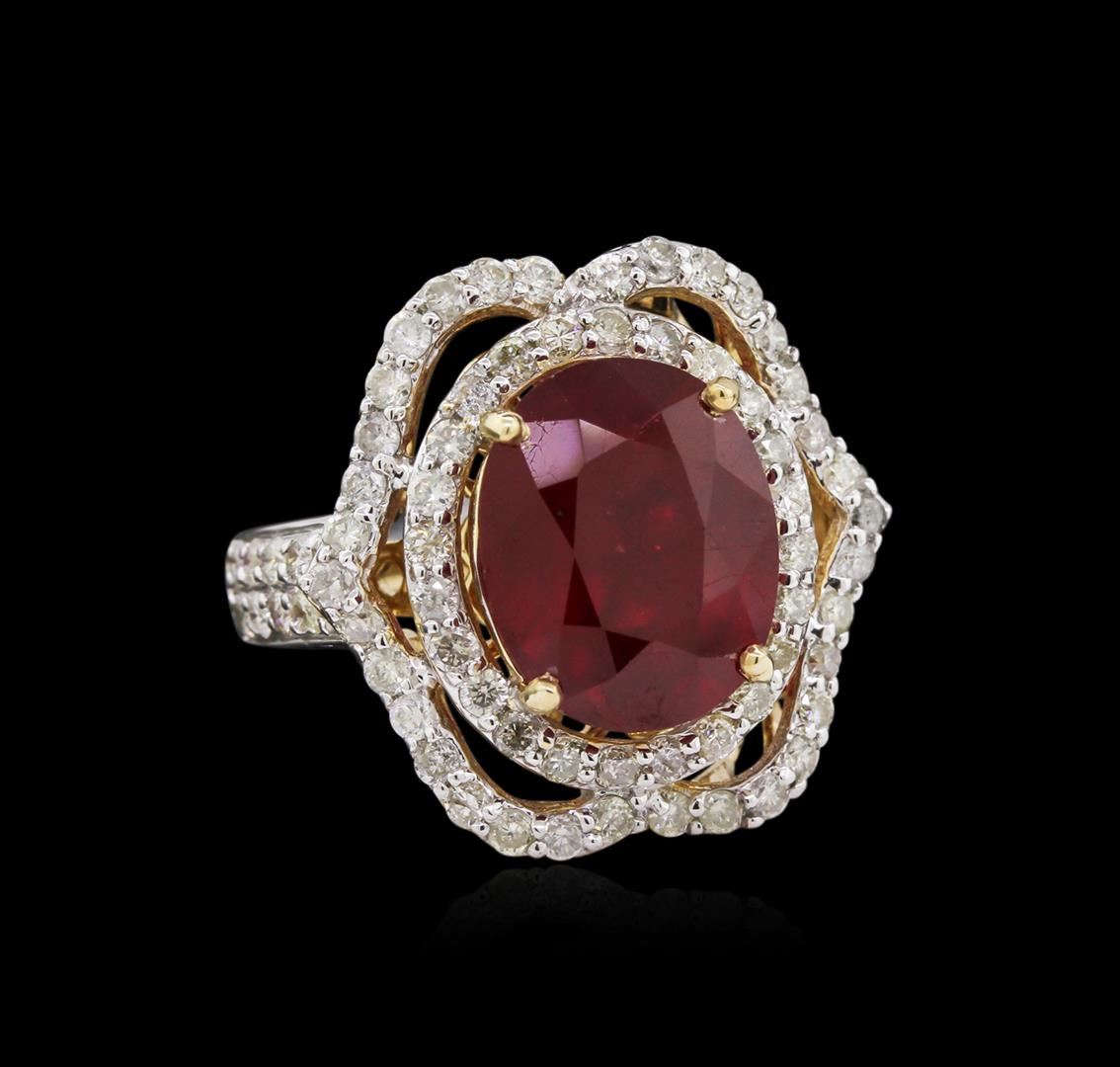 Fourteen karat (14K) yellow gold ruby and diamond ring. An oval cut ruby corundum gemstone is prong mounted in the center of the ring. Round brilliant cut diamonds accent the ring around the center gemstone. The ring is cast stamped "14K" and has a gross GGA Appraised.