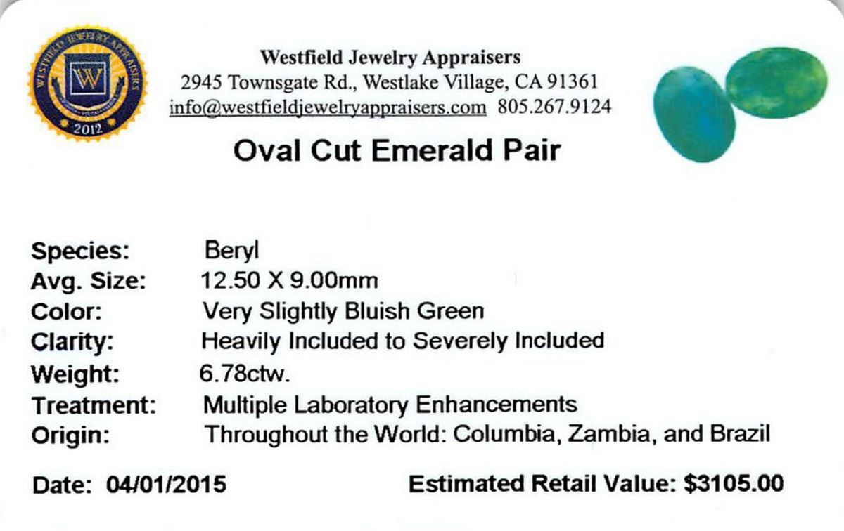 Two oval mixed cut natural emeralds exact total weight 6.78ct., clarity is heavily included, type III, medium dark, very slightly grayish, very slightly bluish green color, (GIA vslbG 6/3), cut is good. Westfield Appraised at $3,105.00.