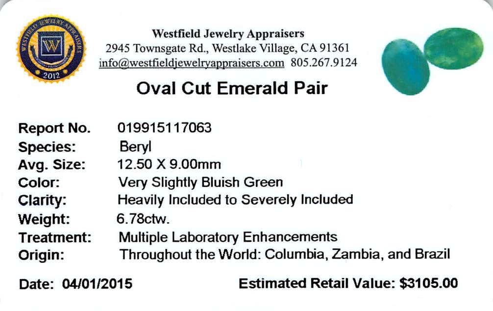 Two oval mixed cut natural emeralds exact total weight 6.78ct., clarity is heavily included, type III, medium dark, very slightly grayish, very slightly bluish green color, (GIA vslbG 6/3), cut is good. Westfield Appraised at $3,105.00.
