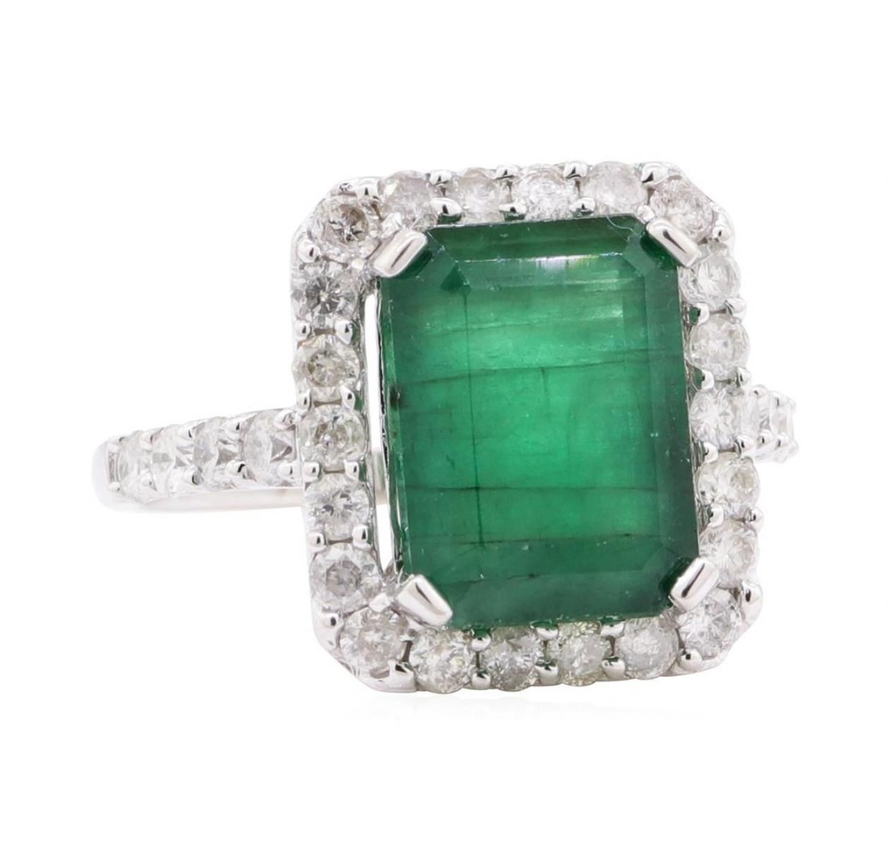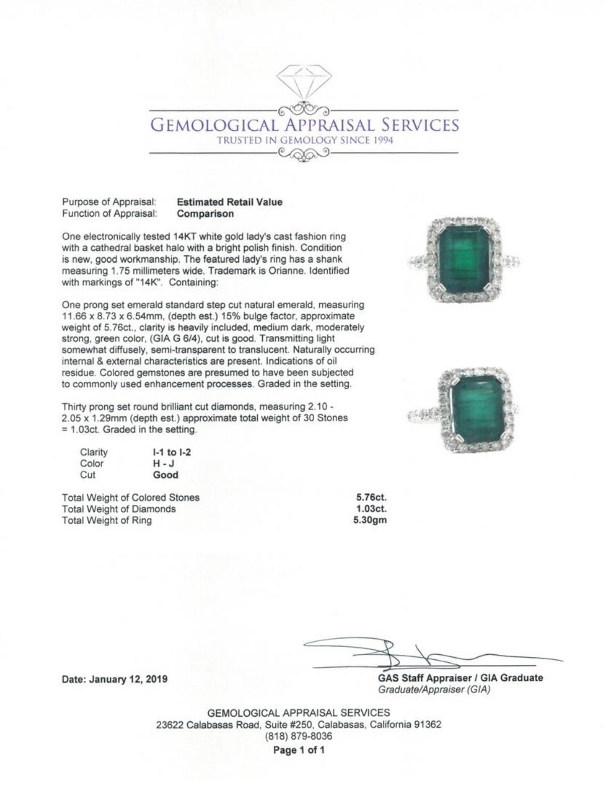 One electronically tested 14KT white gold lady's cast fashion ring with a cathedral basket halo with a bright polish finish. The featured lady's ring has a shank measuring 1.75 millimeters wide. Trademark is Orianne. Identified with markings of '14K'. Condition is new, good workmanship. Containing: One prong set emerald standard step cut natural emerald, measuring 11.66 x 8.73 x 6.54mm, (depth est.) 15%. bulge factor, approximate weight of 5.76ct., clarity is heavily included, medium dark, moderately strong, green color, (GIA G 6/4), cut is good. Transmitting light somewhat diffusely, semi-transparent to translucent. Naturally occurring internal & external characteristics are present. Indications of oil residue. Colored gemstones are presumed to have been subjected to commonly used enhancement processes. Graded in the setting. Thirty prong set round brilliant cut diamonds, measuring 2.10 - 2.05 x 1.29mm (depth est.) approximate total weight of 30 Stones = 1.03ct. Graded in the setting. Color H - J Clarity I-1 to I-2 Cut Good. Total Weight of Colored Stones 5.76ct.. Total Weight of Diamonds 1.03ct.. Total Weight of Ring 5.30gm GAS Appraised at $16080.00. GAS Appraised.