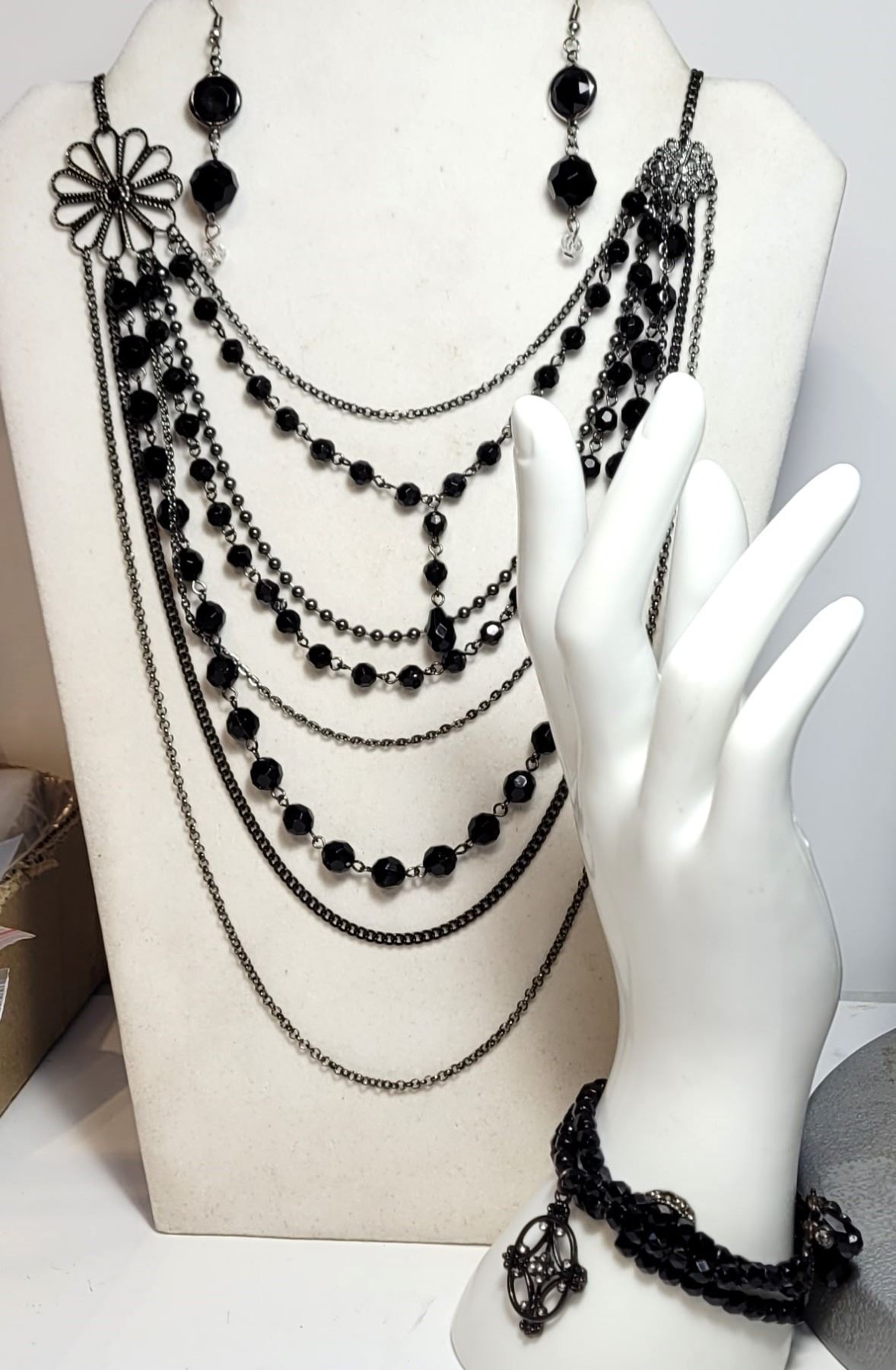 CHAINS, BLACK CRYSTALS AND CHARMS AND DRAMATIC BEZEL SET BLACK CRYSTAL DROP EARRINGS AND TRIPLE STRAND STRETCHY BRACELET WITH MULTIPLE CHARMS. JEWELLERY