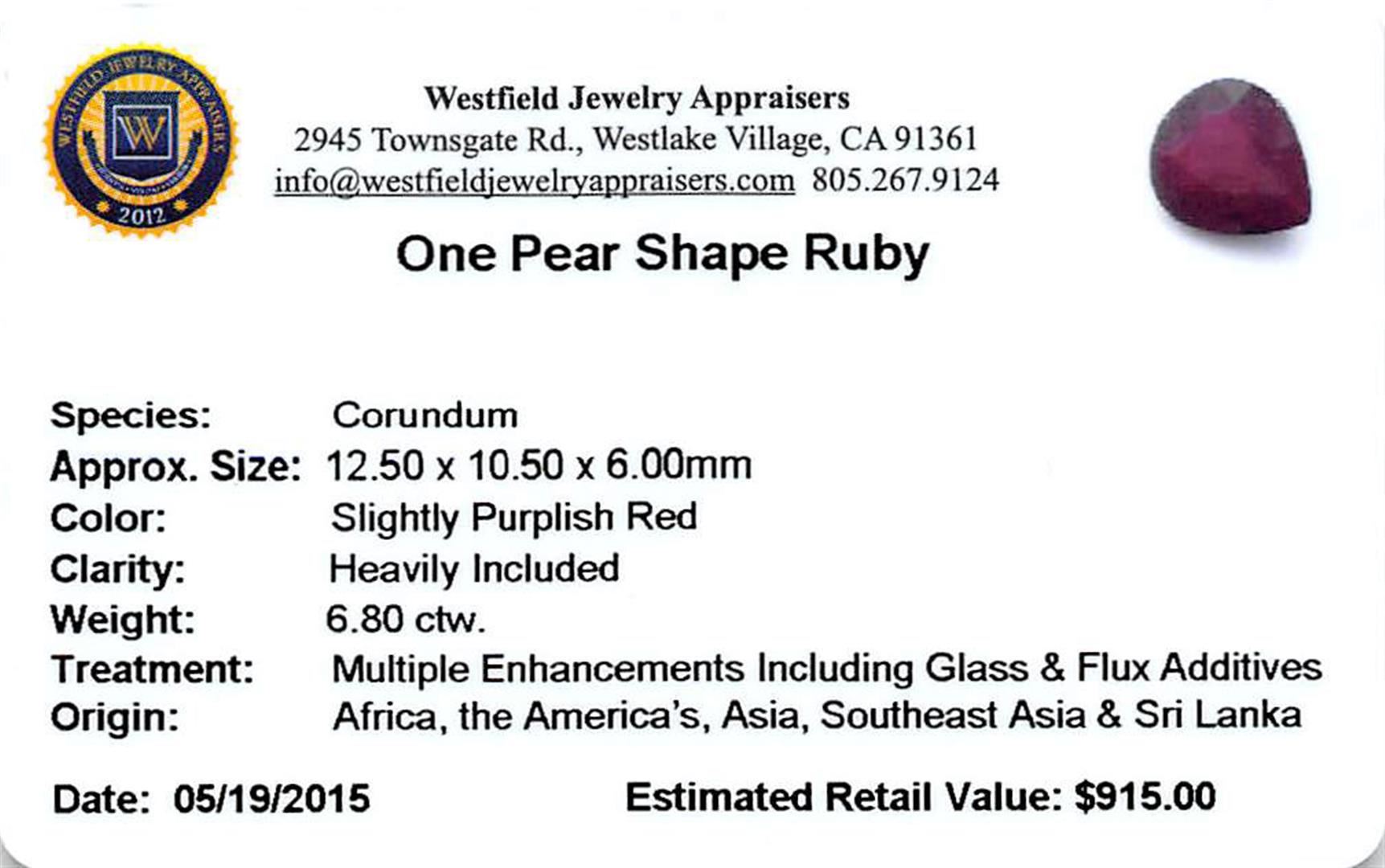 One pear mixed cut natural ruby, measuring 12.50 x 10.50 x 6.00mm, exact weight 6.80ct., clarity is heavily included, type II, medium dark, very slightly brownish, slightly purplish red color, (GIA slpR 6/3), cut is good. Westfield Appraised at $915.00.
