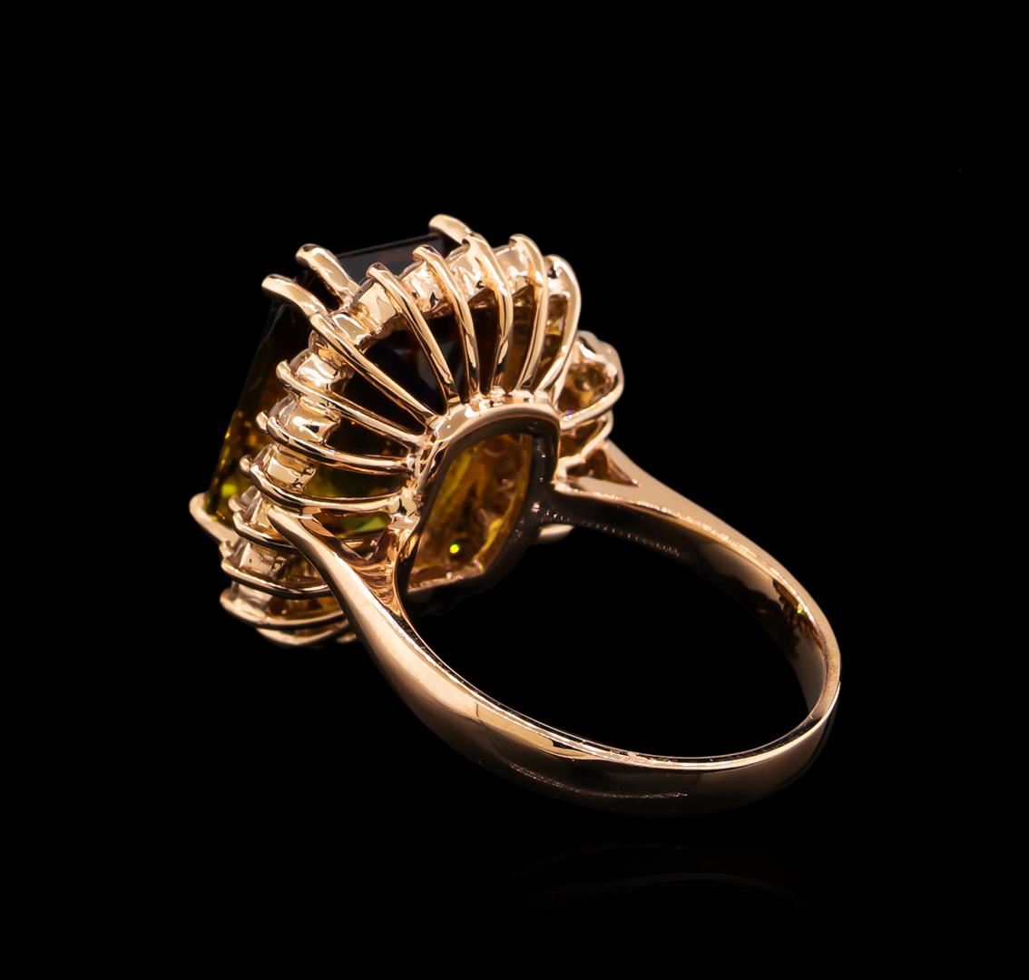 One electronically tested 14KT rose gold lady's cast fashion ring with a basket halo with a bright polish finish. The featured lady's ring has a shank measuring 2.80 millimeters wide. Identified with markings of "K14". Condition is new, good workmanship. Containing: One prong set emerald step cut natural ametrine quartz, measuring 13.99 x 10.01 x 6.92mm, approximate weight of 6.81ct., clarity is eye clean, type I, medium dark, moderately strong, purple color, (GIA P 6/4) to medium dark, moderately strong, yellow, (GIA Y 6/4), cut is very good. Transmitting light with no distortion, transparent. Colored gemstones are presumed to have been subjected to commonly used enhancement processes. Graded in the setting. Thirty prong set round brilliant cut diamonds, measuring 2.10 - 2.00 x 1.25mm (depth est.) approximate total weight of 30 Stones = 0.96ct. Graded in the setting. Clarity: SI-1 to SI-2. Color: H - I. Cut Good. Total Weight of Colored Stones 6.81ct. Total Weight of Diamonds 0.96ct. Total Weight of Ring 8.00gm GAS Appraised.