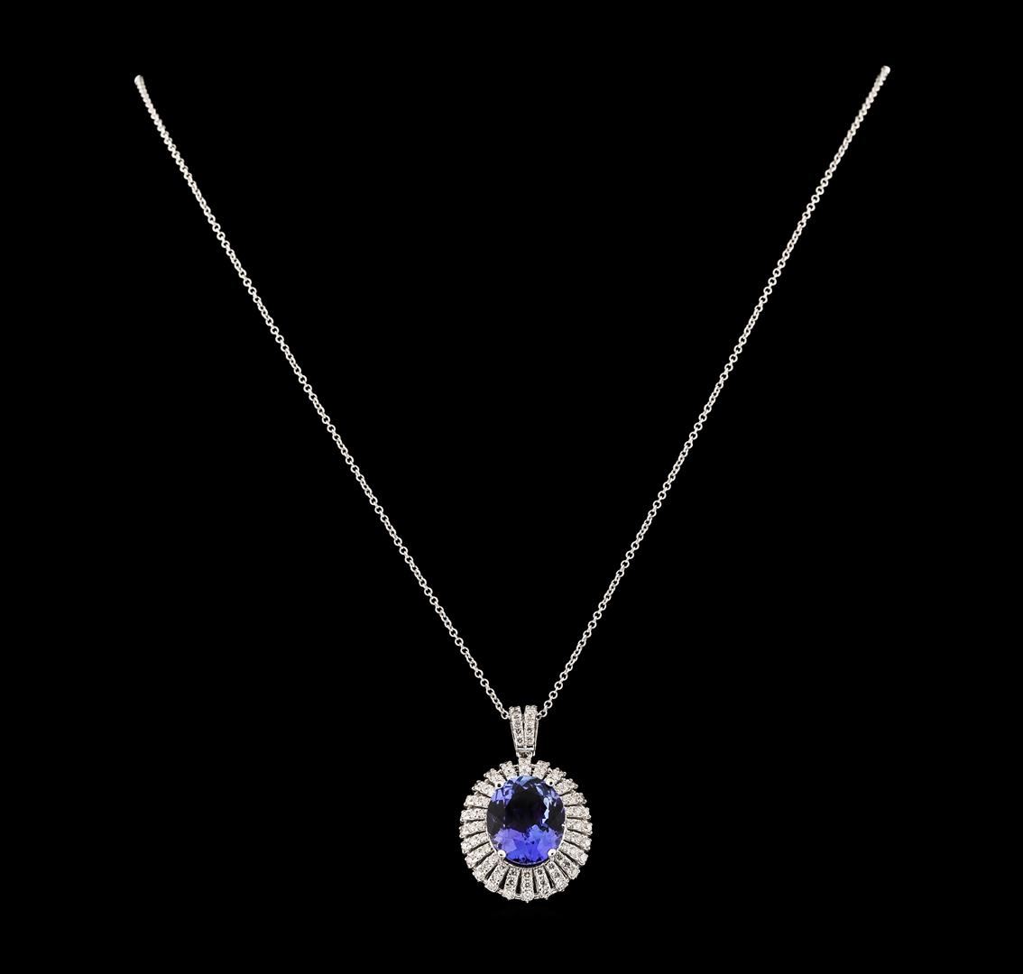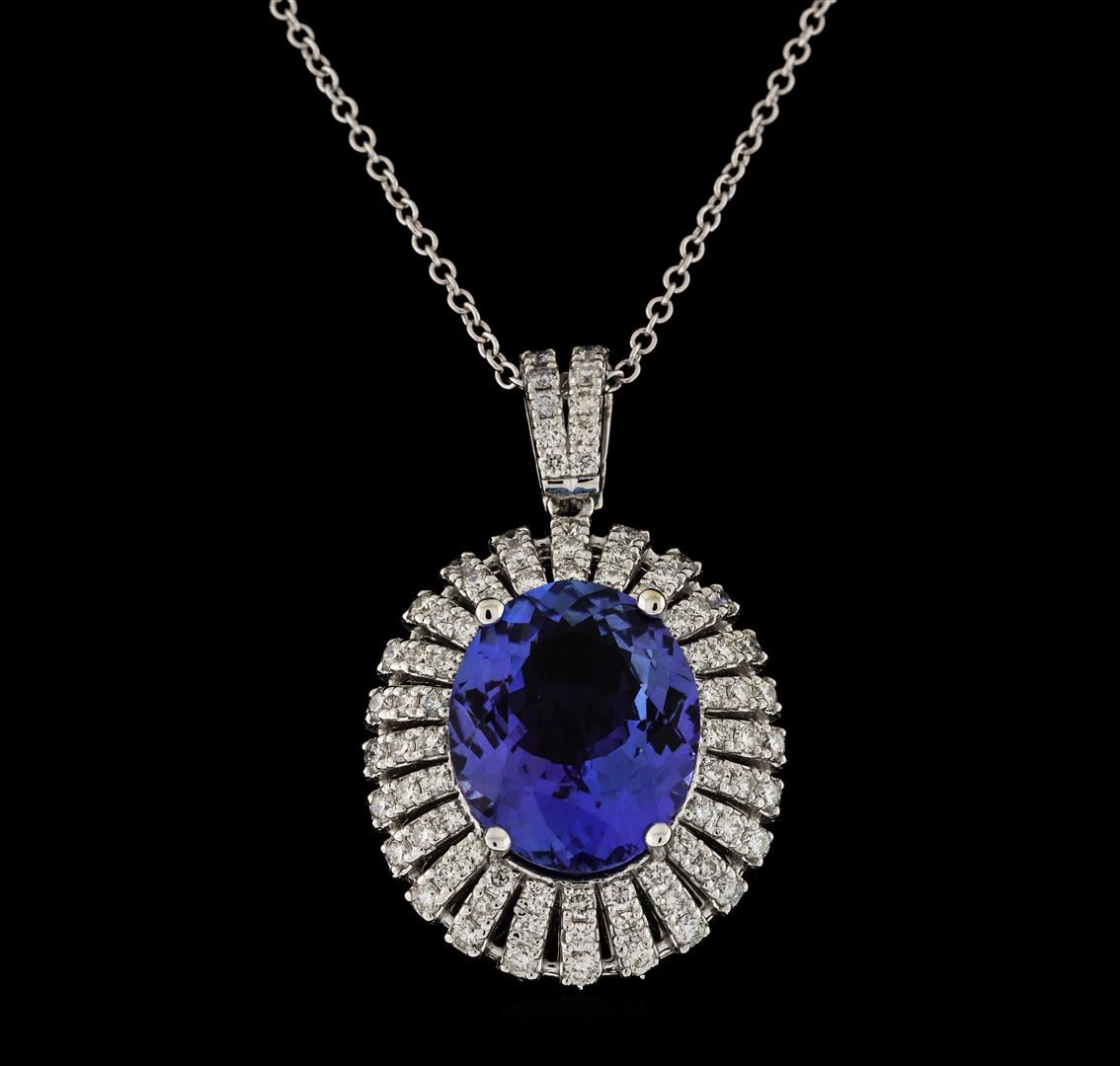 One electronically tested 14KT white gold lady's combination cast & assembled fashion pendant & chain 18.0' long, 1.3mm round cable link with a lobster claw clasp with a triple basket halo with a bright polish finish. The featured lady's pendant has a length of 30 millimeters and an attached diamond encrusted V-shaped bail. Identified with markings of '14K'. Condition is new, good workmanship. Containing: One prong set oval modified brilliant cut natural tanzanite, measuring 13.45 x 11.10 x 6.45mm, (depth est.) approximate weight of 6.81ct., clarity is eye clean, medium light, moderately strong, violet color, (GIA V 4/4), cut is very good. Transmitting light with no distortion, transparent. Colored gemstones are presumed to have been subjected to commonly used enhancement processes. Graded in the setting. Twenty-Four prong set round brilliant cut diamonds, measuring 1.60 - 1.55 x 0.98mm (depth est.) approximate total weight of 24 Stones = 0.36ct. Graded in the setting. Clarity SI-1 to SI-2. Color: G - H Cut Good Fifty-Nine prong set round brilliant cut diamonds, measuring 1.40 - 1.30 x 0.84mm (depth est.) approximate total weight of 59 Stones = 0.55ct. Graded in the setting. Clarity SI-1 to SI-2. Color: G - H Cut Good. Total Weight of Colored Stones 6.81ct.. Total Weight of Diamonds 0.91ct.. Total Weight of Pendant & Chain 7.90gm GAS Appraised at $10,065.00.