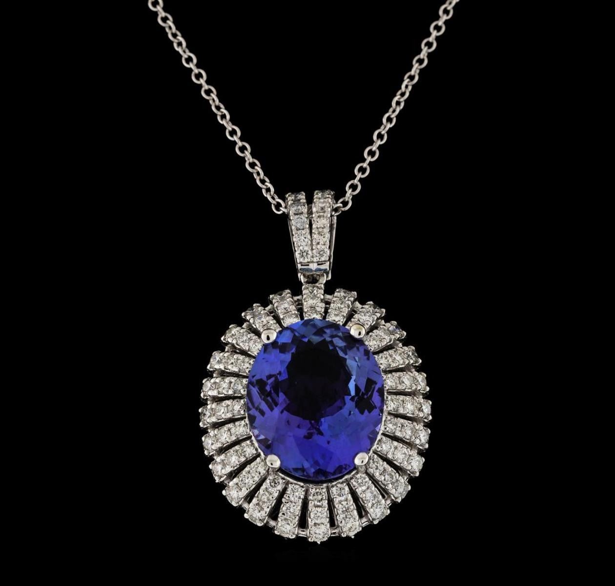 One electronically tested 14KT white gold lady's combination cast & assembled fashion pendant & chain 18.0' long, 1.3mm round cable link with a lobster claw clasp with a triple basket halo with a bright polish finish. The featured lady's pendant has a length of 30 millimeters and an attached diamond encrusted V-shaped bail. Identified with markings of '14K'. Condition is new, good workmanship. Containing: One prong set oval modified brilliant cut natural tanzanite, measuring 13.45 x 11.10 x 6.45mm, (depth est.) approximate weight of 6.81ct., clarity is eye clean, medium light, moderately strong, violet color, (GIA V 4/4), cut is very good. Transmitting light with no distortion, transparent. Colored gemstones are presumed to have been subjected to commonly used enhancement processes. Graded in the setting. Twenty-Four prong set round brilliant cut diamonds, measuring 1.60 - 1.55 x 0.98mm (depth est.) approximate total weight of 24 Stones = 0.36ct. Graded in the setting. Clarity SI-1 to SI-2. Color: G - H Cut Good Fifty-Nine prong set round brilliant cut diamonds, measuring 1.40 - 1.30 x 0.84mm (depth est.) approximate total weight of 59 Stones = 0.55ct. Graded in the setting. Clarity SI-1 to SI-2. Color: G - H Cut Good. Total Weight of Colored Stones 6.81ct.. Total Weight of Diamonds 0.91ct.. Total Weight of Pendant & Chain 7.90gm GAS Appraised at $10,065.00.
