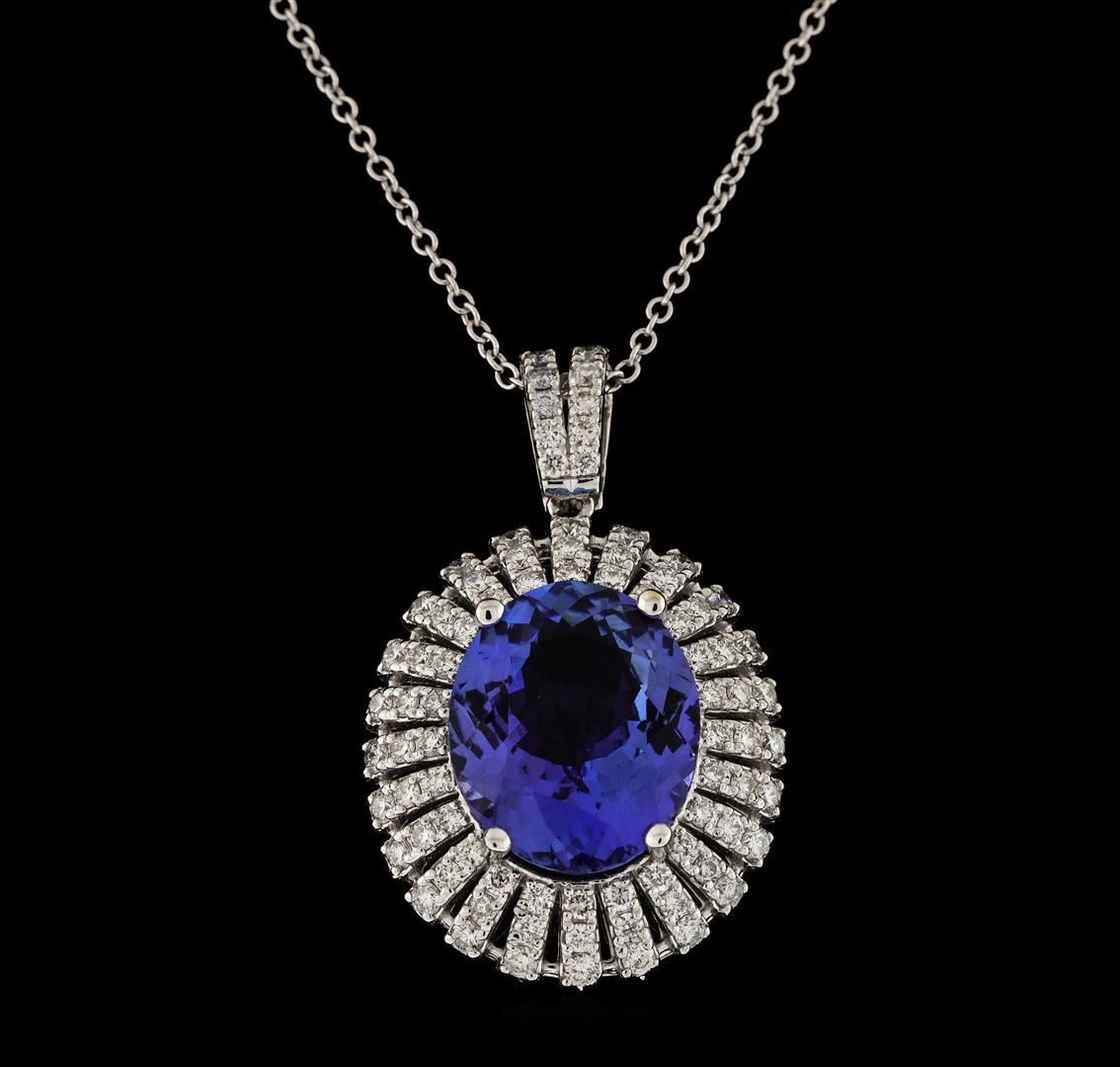 One electronically tested 14KT white gold lady's combination cast & assembled fashion pendant & chain 18.0' long, 1.3mm round cable link with a lobster claw clasp with a triple basket halo with a bright polish finish. The featured lady's pendant has a length of 30 millimeters and an attached diamond encrusted V-shaped bail. Identified with markings of '14K'. Condition is new, good workmanship. Containing: One prong set oval modified brilliant cut natural tanzanite, measuring 13.45 x 11.10 x 6.45mm, (depth est.) approximate weight of 6.81ct., clarity is eye clean, medium light, moderately strong, violet color, (GIA V 4/4), cut is very good. Transmitting light with no distortion, transparent. Colored gemstones are presumed to have been subjected to commonly used enhancement processes. Graded in the setting. Twenty-Four prong set round brilliant cut diamonds, measuring 1.60 - 1.55 x 0.98mm (depth est.) approximate total weight of 24 Stones = 0.36ct. Graded in the setting. Clarity SI-1 to SI-2. Color: G - H Cut Good Fifty-Nine prong set round brilliant cut diamonds, measuring 1.40 - 1.30 x 0.84mm (depth est.) approximate total weight of 59 Stones = 0.55ct. Graded in the setting. Clarity SI-1 to SI-2. Color: G - H Cut Good. Total Weight of Colored Stones 6.81ct.. Total Weight of Diamonds 0.91ct.. Total Weight of Pendant & Chain 7.90gm GAS Appraised.