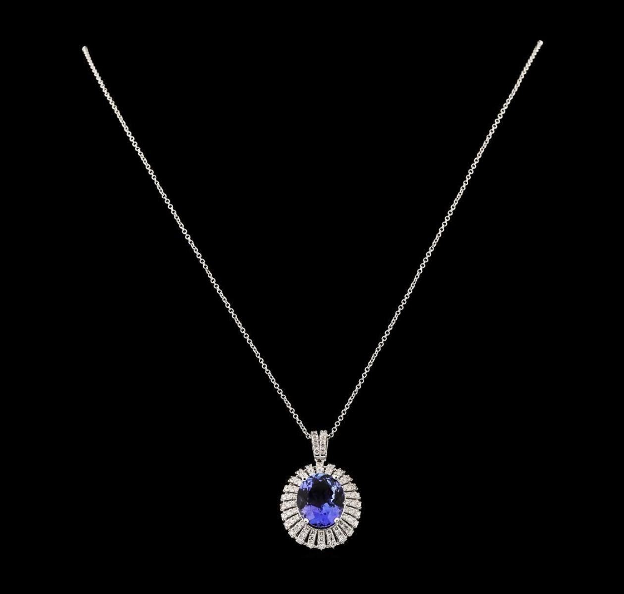 One electronically tested 14KT white gold lady's combination cast & assembled fashion pendant & chain 18.0' long, 1.3mm round cable link with a lobster claw clasp with a triple basket halo with a bright polish finish. The featured lady's pendant has a length of 30 millimeters and an attached diamond encrusted V-shaped bail. Identified with markings of '14K'. Condition is new, good workmanship. Containing: One prong set oval modified brilliant cut natural tanzanite, measuring 13.45 x 11.10 x 6.45mm, (depth est.) approximate weight of 6.81ct., clarity is eye clean, medium light, moderately strong, violet color, (GIA V 4/4), cut is very good. Transmitting light with no distortion, transparent. Colored gemstones are presumed to have been subjected to commonly used enhancement processes. Graded in the setting. Twenty-Four prong set round brilliant cut diamonds, measuring 1.60 - 1.55 x 0.98mm (depth est.) approximate total weight of 24 Stones = 0.36ct. Graded in the setting. Clarity SI-1 to SI-2. Color: G - H Cut Good Fifty-Nine prong set round brilliant cut diamonds, measuring 1.40 - 1.30 x 0.84mm (depth est.) approximate total weight of 59 Stones = 0.55ct. Graded in the setting. Clarity SI-1 to SI-2. Color: G - H Cut Good. Total Weight of Colored Stones 6.81ct.. Total Weight of Diamonds 0.91ct.. Total Weight of Pendant & Chain 7.90gm GAS Appraised.