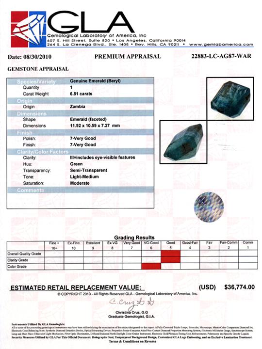 Excellent green colored specimen emerald cut; lab quality evaluation 5; treatment as noted; Gem Guide wholesale $6129-$8513; full retail appraisal $36774; full lab evaluation included