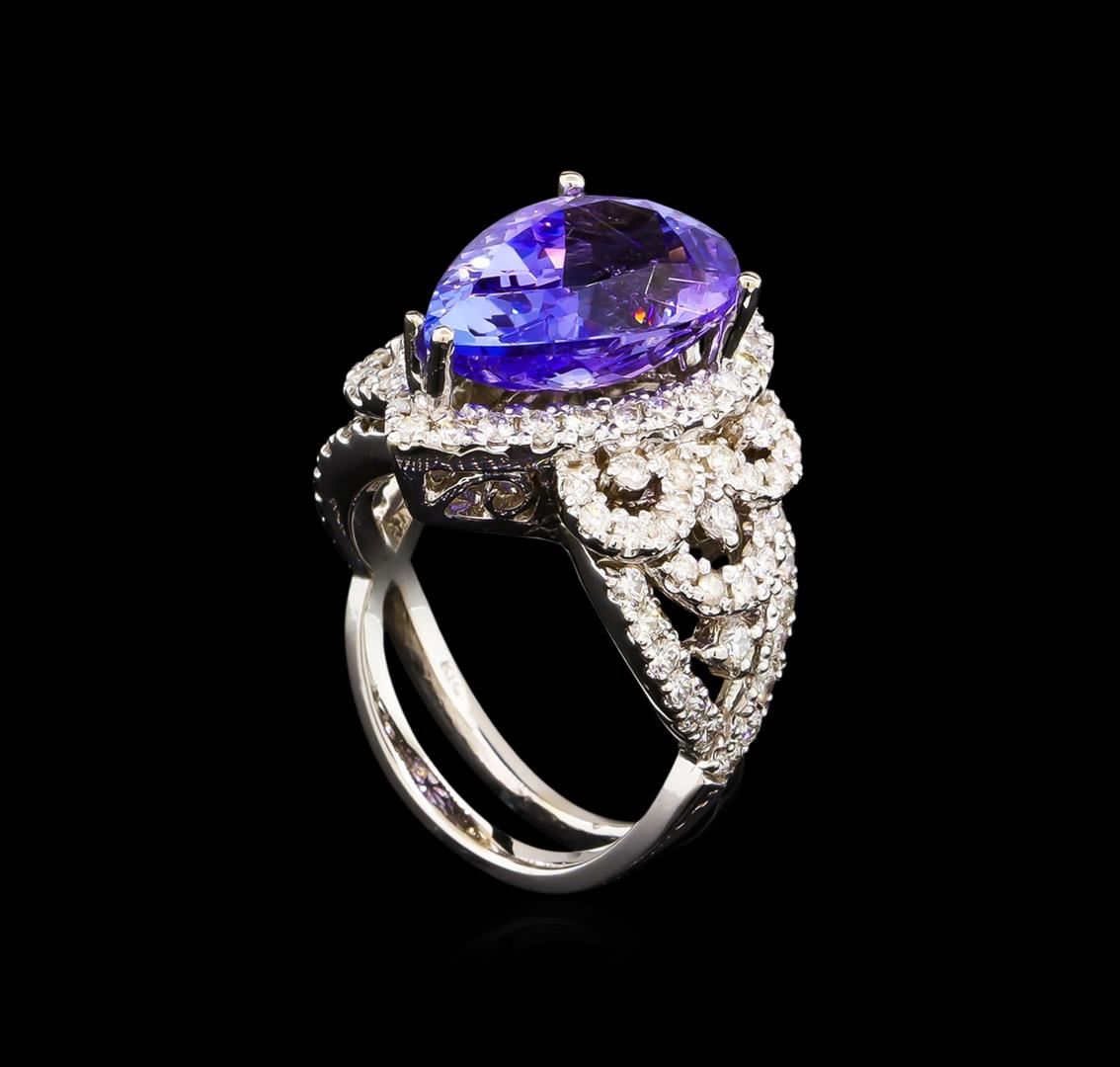 One electronically tested 14KT white gold lady's cast fashion ring with a crossover split shank with a bright polish finish. The featured lady's ring has a double shank measuring 5.85 millimeters wide. Identified with markings of "K14". Condition is new, good workmanship. Containing: One prong set pear modified brilliant cut natural tanzanite, measuring 15.05 x 10.45 x 6.79mm, approximate weight of 6.82ct., clarity is eye clean, type I, medium, moderately strong, bluish violet color, (GIA bV 5/4), cut is very good. Transmitting light with no distortion, transparent. Colored gemstones are presumed to have been subjected to commonly used enhancement processes. Graded in the setting. Four prong set round brilliant cut diamonds, measuring 2.00 - 1.80 x 1.18mm (depth est.) approximate total weight of 4 Stones = 0.12ct. Graded in the setting. Clarity: SI-1 to I-1. Color: H - I. Cut Good Eighty-Nine round brilliant cut diamonds, measuring 1.55 - 1.40 x 0.92mm (depth est.) approximate total weight of 89 Stones = 1.12ct. Graded in the setting. Total Weight of Colored Stones 6.82ct. Total Weight of Diamonds 1.24ct. Total Weight of Ring 10.30gm. GAS Appraised at $14,155.00.