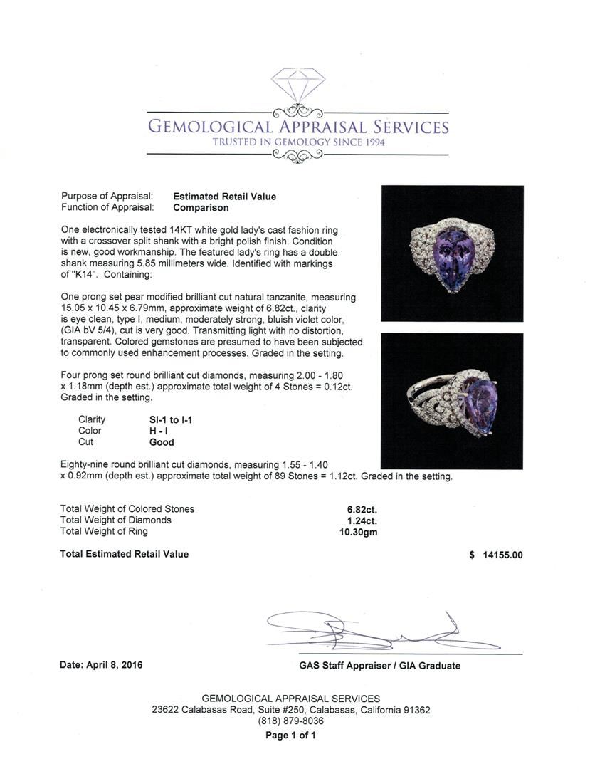 One electronically tested 14KT white gold lady's cast fashion ring with a crossover split shank with a bright polish finish. The featured lady's ring has a double shank measuring 5.85 millimeters wide. Identified with markings of "K14". Condition is new, good workmanship. Containing: One prong set pear modified brilliant cut natural tanzanite, measuring 15.05 x 10.45 x 6.79mm, approximate weight of 6.82ct., clarity is eye clean, type I, medium, moderately strong, bluish violet color, (GIA bV 5/4), cut is very good. Transmitting light with no distortion, transparent. Colored gemstones are presumed to have been subjected to commonly used enhancement processes. Graded in the setting. Four prong set round brilliant cut diamonds, measuring 2.00 - 1.80 x 1.18mm (depth est.) approximate total weight of 4 Stones = 0.12ct. Graded in the setting. Clarity: SI-1 to I-1. Color: H - I. Cut Good Eighty-Nine round brilliant cut diamonds, measuring 1.55 - 1.40 x 0.92mm (depth est.) approximate total weight of 89 Stones = 1.12ct. Graded in the setting. Total Weight of Colored Stones 6.82ct. Total Weight of Diamonds 1.24ct. Total Weight of Ring 10.30gm. GAS Appraised at $14,155.00.