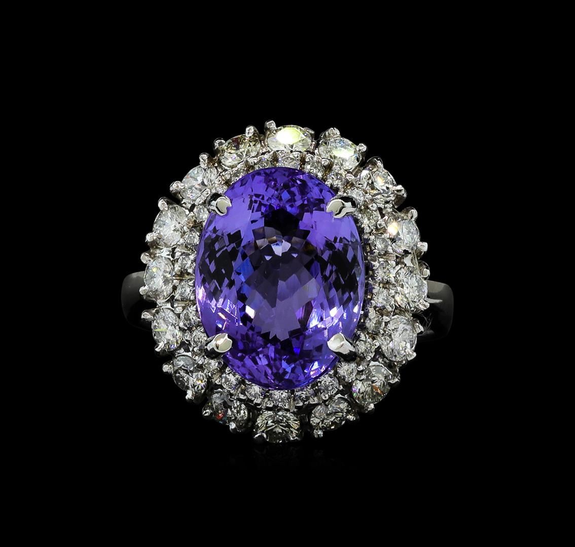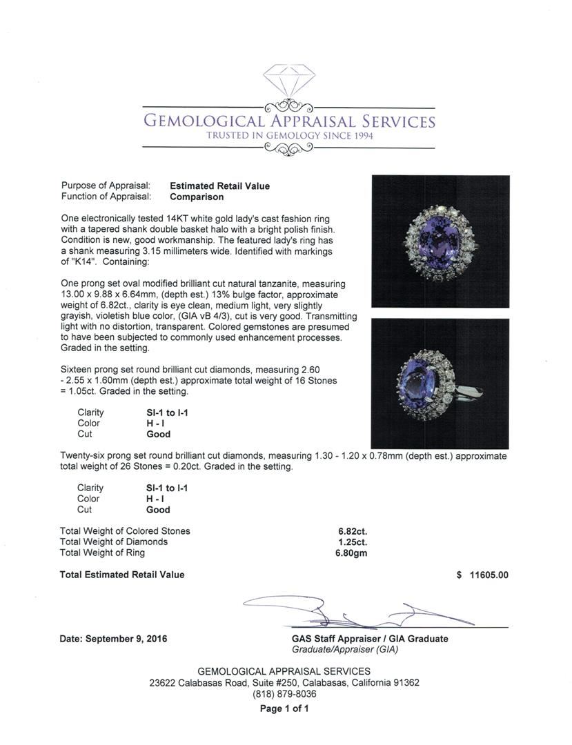 One electronically tested 14KT white gold lady's cast fashion ring with a tapered shank double basket halo with a bright polish finish. The featured lady's ring has a shank measuring 3.15 millimeters wide. Identified with markings of 'K14'. Condition is new, good workmanship. Containing: One prong set oval modified brilliant cut natural tanzanite, measuring 13.00 x 9.88 x 6.64mm, (depth est.) 13%. bulge factor, approximate weight of 6.82ct., clarity is eye clean, medium light, very slightly grayish, violetish blue color, (GIA vB 4/3), cut is very good. Transmitting light with no distortion, transparent. Colored gemstones are presumed to have been subjected to commonly used enhancement processes. Graded in the setting. Sixteen prong set round brilliant cut diamonds, measuring 2.60 - 2.55 x 1.60mm (depth est.) approximate total weight of 16 Stones = 1.05ct. Graded in the setting. Clarity SI-1 to I-1. Color: H - I Cut Good Twenty-Six prong set round brilliant cut diamonds, measuring 1.30 - 1.20 x 0.78mm (depth est.) approximate total weight of 26 Stones = 0.20ct. Graded in the setting. Clarity SI-1 to I-1. Color: H - I Cut Good. Total Weight of Colored Stones 6.82ct.. Total Weight of Diamonds 1.25ct.. Total Weight of Ring 6.80gm GAS Appraised at $11,605.00.