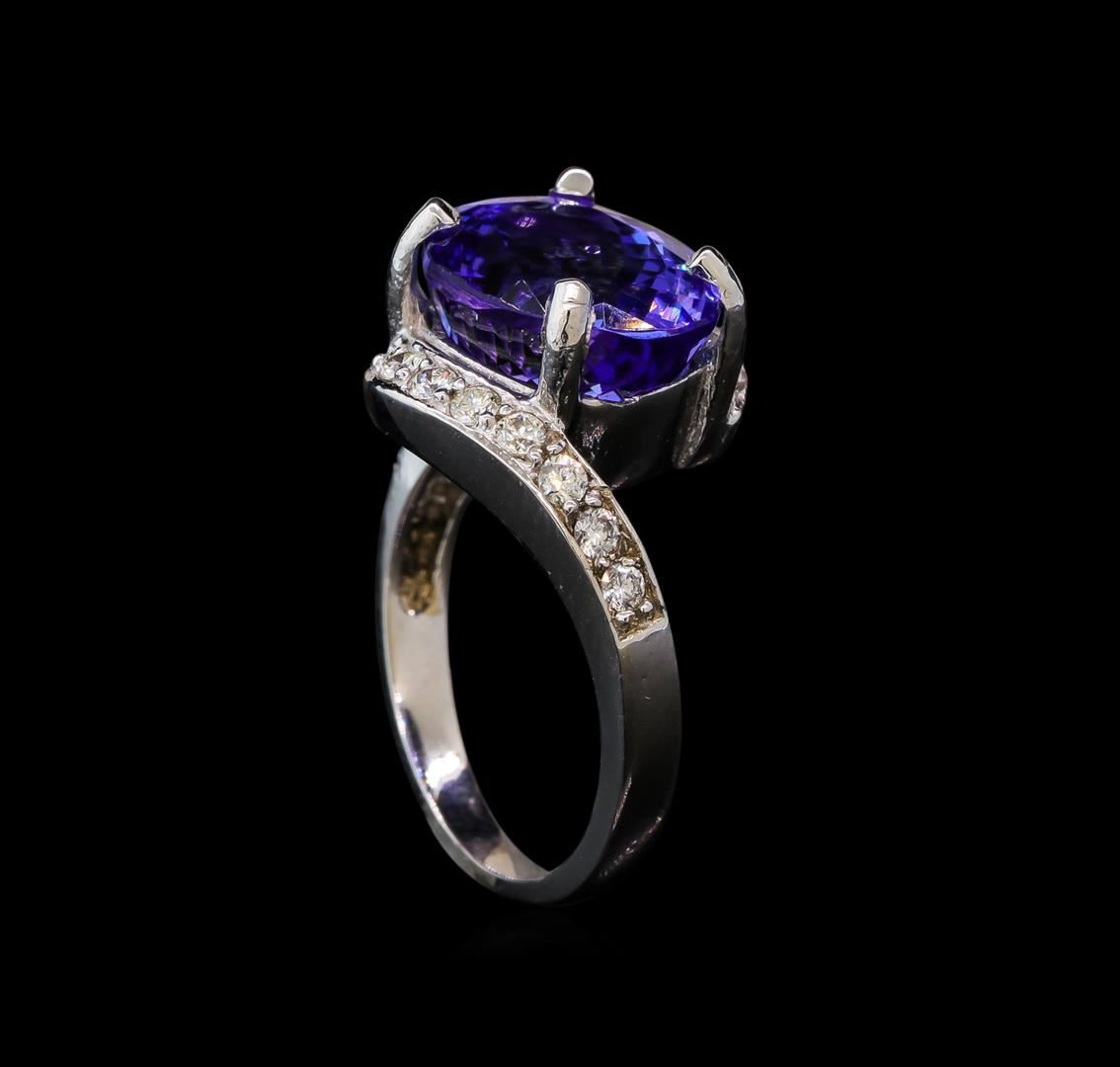 One electronically tested 14KT white gold lady's cast fashion ring with a bypass shank with a bright polish finish. The featured lady's ring has a shank measuring 2.31 millimeters wide. Identified with markings of '14K'. Condition is new, good workmanship. Containing: One prong set oval modified brilliant cut natural tanzanite, measuring 11.87 x 10.06 x 7.44mm, (depth est.) 10%. bulge factor, approximate weight of 6.82ct., clarity is eye clean, medium, moderately strong, violetish blue color, (GIA vB 5/4), cut is very good. Transmitting light with no distortion, transparent. Colored gemstones are presumed to have been subjected to commonly used enhancement processes. Graded in the setting. Sixteen prong set round brilliant cut diamonds, measuring 1.90 - 1.85 x 1.17mm (depth est.) approximate total weight of 16 Stones = 0.40ct. Graded in the setting. Clarity SI-1 to I-1. Color: H - I Cut Good. Total Weight of Colored Stones 6.82ct.. Total Weight of Diamonds 0.40ct.. Total Weight of Ring 5.90gm