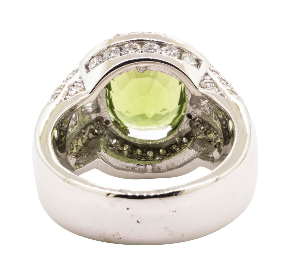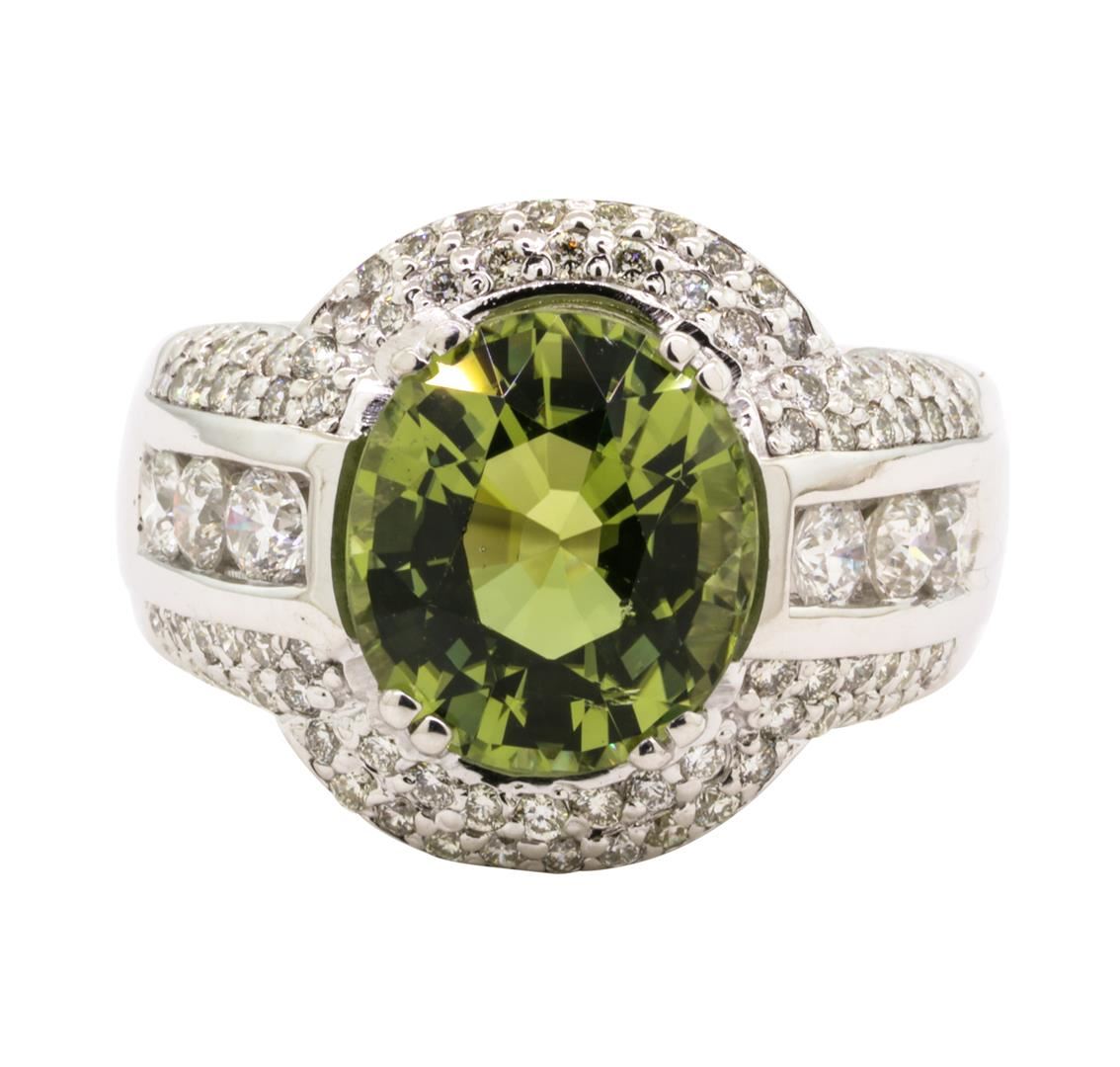 One electronically tested 14KT white gold lady's cast fashion ring with a cathedral wide halo with a bright polish finish. The featured lady's ring has a shank measuring 6.70 millimeters wide. Identified with markings of '14K'. Condition is new, good workmanship. Containing: One prong set oval modified mixed cut natural green tourmaline, measuring 12.08 x 10.58 x 7.39mm, (depth est.) approximate weight of 6.07ct., clarity is eye clean, medium light, very slightly grayish, strongly yellowish green color, (GIA styG 4/3), cut is very good. Transmitting light with no distortion, transparent. Colored gemstones are presumed to have been subjected to commonly used enhancement processes. Graded in the setting. Six channel set round brilliant cut diamonds, measuring 3.30 - 3.10 x 1.98mm (depth est.) approximate total weight of 6 Stones = 0.75ct. Graded in the setting. Color H - I Clarity VS-2 to SI-1 Cut Very Good Sixteen channel set round brilliant cut diamonds, measuring 2.10 - 2.00 x 1.27mm (depth est.) approximate total weight of 16 Stones = 0.52ct. Graded in the setting. Color H - I Clarity SI-1 to SI-2 Cut Very Good Eighty-Six prong set round brilliant cut diamonds, measuring 1.50 - 1.40 x 0.90mm (depth est.) approximate total weight of 86 Stones = 1.00ct. Graded in the setting. Color H - I Clarity SI-1 to SI-2 Cut Very Good. Total Weight of Colored Stones 6.07ct.. Total Weight of Diamonds 2.27ct.. Total Weight of Ring 17.50gm GAS Appraised at $9115.00. GAS Appraised at $9,115.00.