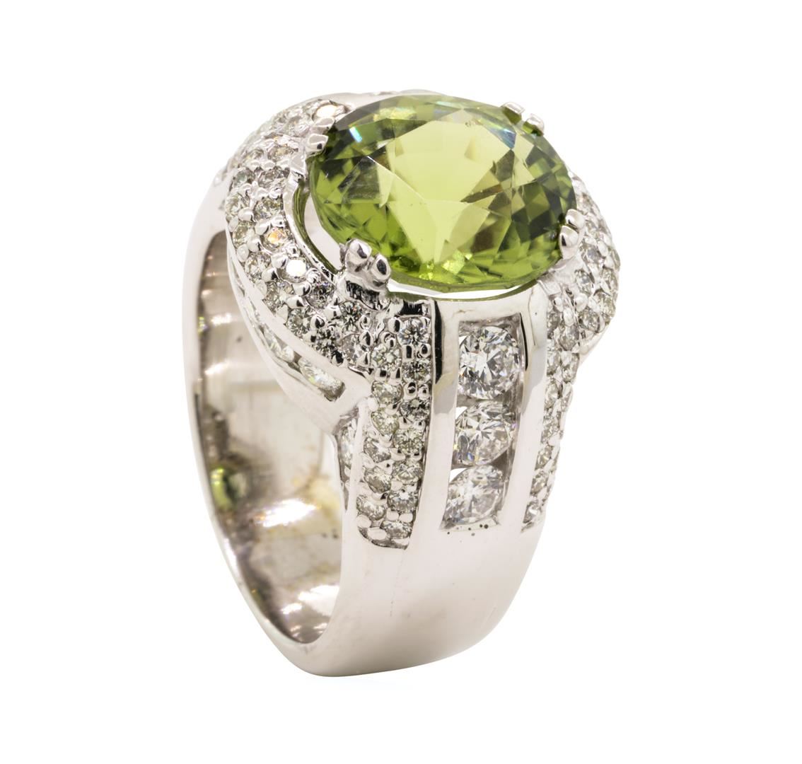One electronically tested 14KT white gold lady's cast fashion ring with a cathedral wide halo with a bright polish finish. The featured lady's ring has a shank measuring 6.70 millimeters wide. Identified with markings of '14K'. Condition is new, good workmanship. Containing: One prong set oval modified mixed cut natural green tourmaline, measuring 12.08 x 10.58 x 7.39mm, (depth est.) approximate weight of 6.07ct., clarity is eye clean, medium light, very slightly grayish, strongly yellowish green color, (GIA styG 4/3), cut is very good. Transmitting light with no distortion, transparent. Colored gemstones are presumed to have been subjected to commonly used enhancement processes. Graded in the setting. Six channel set round brilliant cut diamonds, measuring 3.30 - 3.10 x 1.98mm (depth est.) approximate total weight of 6 Stones = 0.75ct. Graded in the setting. Color H - I Clarity VS-2 to SI-1 Cut Very Good Sixteen channel set round brilliant cut diamonds, measuring 2.10 - 2.00 x 1.27mm (depth est.) approximate total weight of 16 Stones = 0.52ct. Graded in the setting. Color H - I Clarity SI-1 to SI-2 Cut Very Good Eighty-Six prong set round brilliant cut diamonds, measuring 1.50 - 1.40 x 0.90mm (depth est.) approximate total weight of 86 Stones = 1.00ct. Graded in the setting. Color H - I Clarity SI-1 to SI-2 Cut Very Good. Total Weight of Colored Stones 6.07ct.. Total Weight of Diamonds 2.27ct.. Total Weight of Ring 17.50gm GAS Appraised at $9115.00. GAS Appraised at $9,115.00.