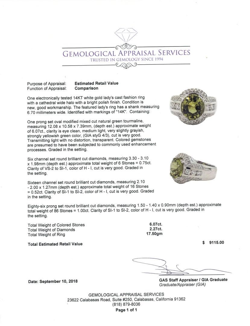 One electronically tested 14KT white gold lady's cast fashion ring with a cathedral wide halo with a bright polish finish. The featured lady's ring has a shank measuring 6.70 millimeters wide. Identified with markings of '14K'. Condition is new, good workmanship. Containing: One prong set oval modified mixed cut natural green tourmaline, measuring 12.08 x 10.58 x 7.39mm, (depth est.) approximate weight of 6.07ct., clarity is eye clean, medium light, very slightly grayish, strongly yellowish green color, (GIA styG 4/3), cut is very good. Transmitting light with no distortion, transparent. Colored gemstones are presumed to have been subjected to commonly used enhancement processes. Graded in the setting. Six channel set round brilliant cut diamonds, measuring 3.30 - 3.10 x 1.98mm (depth est.) approximate total weight of 6 Stones = 0.75ct. Graded in the setting. Color H - I Clarity VS-2 to SI-1 Cut Very Good Sixteen channel set round brilliant cut diamonds, measuring 2.10 - 2.00 x 1.27mm (depth est.) approximate total weight of 16 Stones = 0.52ct. Graded in the setting. Color H - I Clarity SI-1 to SI-2 Cut Very Good Eighty-Six prong set round brilliant cut diamonds, measuring 1.50 - 1.40 x 0.90mm (depth est.) approximate total weight of 86 Stones = 1.00ct. Graded in the setting. Color H - I Clarity SI-1 to SI-2 Cut Very Good. Total Weight of Colored Stones 6.07ct.. Total Weight of Diamonds 2.27ct.. Total Weight of Ring 17.50gm GAS Appraised at $9115.00. GAS Appraised at $9,115.00.