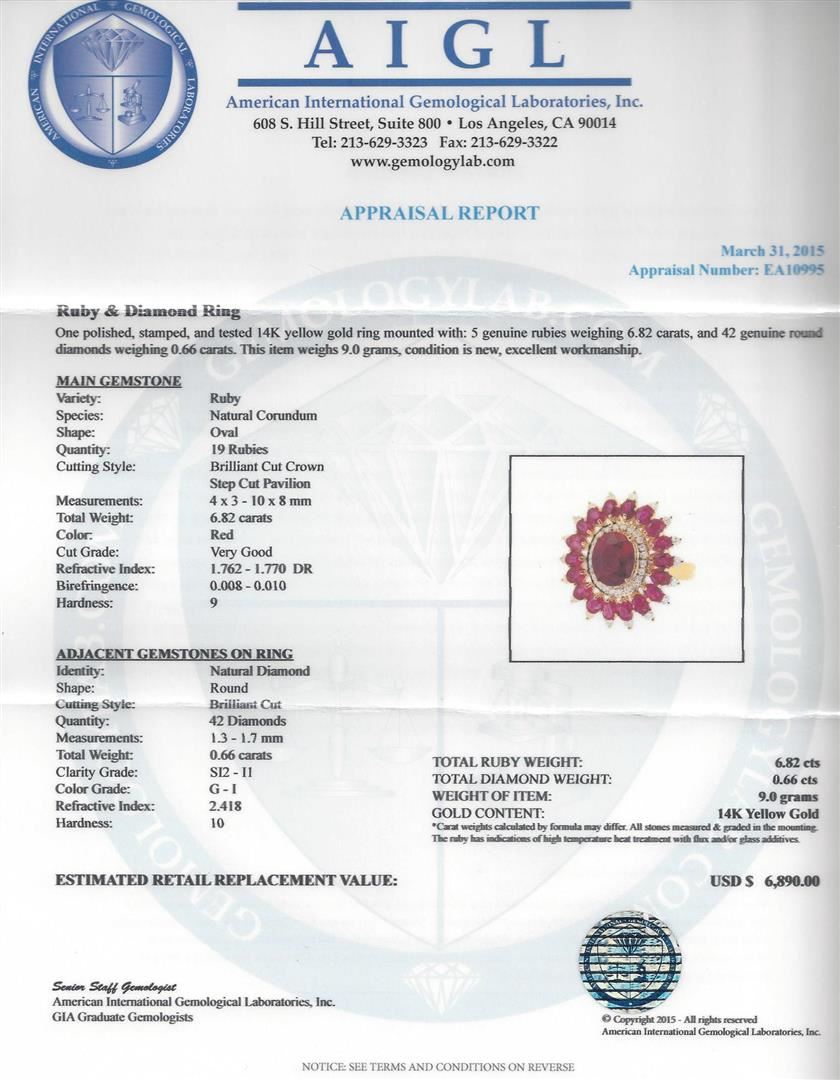 One polished, stamped, and tested 14K yellow gold ring mounted with: 5 genuine rubies weighing 6.82ct, and 42 genuine round diamonds weighing 0.66ct. This item weighs 9.00 grams, condition is new, excellent workmanship. Main Gemstone: Variety: Ruby. Species: Natural corundum. Shape: Oval. Quantity: 19 rubies. Cutting Style: Brilliant cut crown; step cut pavilion. Measurements: 4 x 3 - 10 x 8mm. Total Weight: 6.82ct. Color: Red. Cut Grade: Very good. Refractive Index: 1.762-1.770 DR. Birefringence: 0.008-0.010. Hardness: 9. Adjacent Gemstones on Ring: Identity: Natural diamond. Shape: Round. Cutting Style: Brilliant cut. Quantity: 42 diamonds. Measurements: 1.30 - 1.70mm. Total Weight: 0.66ct. Clarity Grade: SI2-I1. Color Grade: G-I. Refractive Index: 2.418. Hardness: 10. Total ruby weight: 6.82ct. Total diamond weight: 0.66ct. Weight of item: 9.00 grams. AIGL Appraised at $6,890.00.
