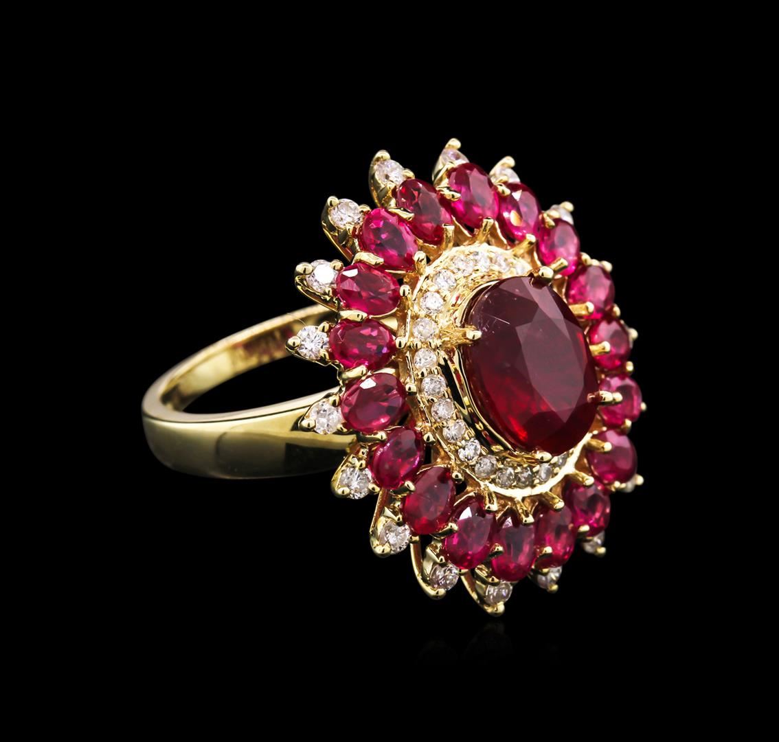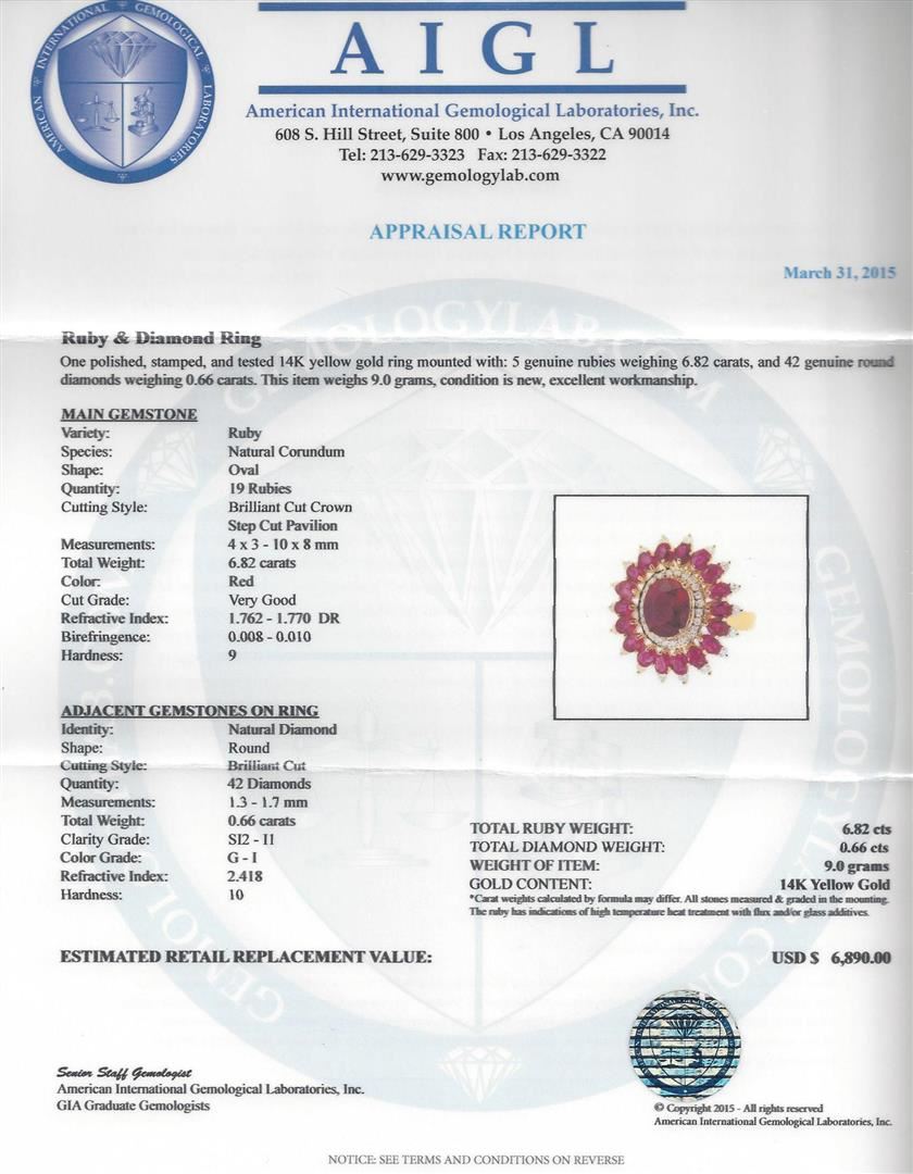 One polished, stamped, and tested 14K yellow gold ring mounted with: 5 genuine rubies weighing 6.82ct, and 42 genuine round diamonds weighing 0.66ct. This item weighs 9.00 grams, condition is new, excellent workmanship. Main Gemstone: Variety: Ruby. Species: Natural corundum. Shape: Oval. Quantity: 19 rubies. Cutting Style: Brilliant cut crown; step cut pavilion. Measurements: 4 x 3 - 10 x 8mm. Total Weight: 6.82ct. Color: Red. Cut Grade: Very good. Refractive Index: 1.762-1.770 DR. Birefringence: 0.008-0.010. Hardness: 9. Adjacent Gemstones on Ring: Identity: Natural diamond. Shape: Round. Cutting Style: Brilliant cut. Quantity: 42 diamonds. Measurements: 1.30 - 1.70mm. Total Weight: 0.66ct. Clarity Grade: SI2-I1. Color Grade: G-I. Refractive Index: 2.418. Hardness: 10. Total ruby weight: 6.82ct. Total diamond weight: 0.66ct. Weight of item: 9.00 grams. AIGL Appraised at $6,890.00.