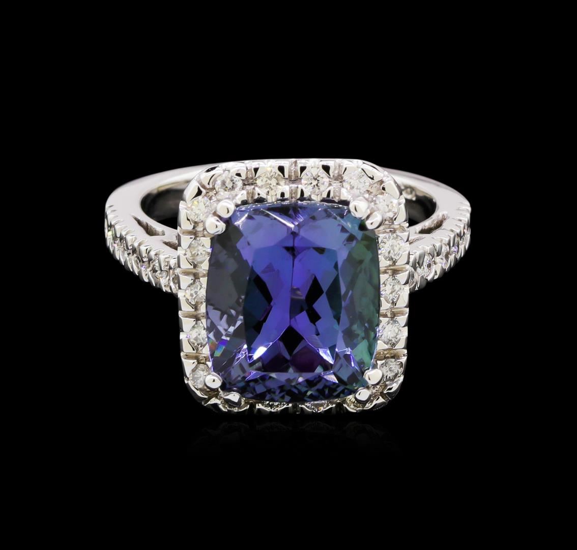 One electronically tested 14KT white gold lady's cast fashion ring with a basket halo with a bright polish finish. The featured lady's ring has a shank measuring 2.27 millimeters wide. Identified with markings of "14K". Condition is new, good workmanship. Containing: One prong set rectangular cushion modified brilliant cut natural tanzanite, measuring 11.43 x 9.78 x 7.62mm, approximate weight of 6.83ct., clarity is eye clean, type I, medium dark, very slightly grayish, violetish blue color, (GIA vB 6/3), cut is very good. Transmitting light with no distortion, transparent. Colored gemstones are presumed to have been subjected to commonly used enhancement processes. Graded in the setting. Thirty prong set round brilliant cut diamonds, measuring 1.60 - 1.50 x 0.96mm (depth est.) approximate total weight of 30 Stones = 0.42ct. Graded in the setting. Clarity: SI-1 to SI-2. Color: H - I. Cut Good. Total Weight of Colored Stones 6.83ct. Total Weight of Diamonds 0.42ct. Total Weight of Ring 8.20gm. GAS Appraised at $13,365.00.