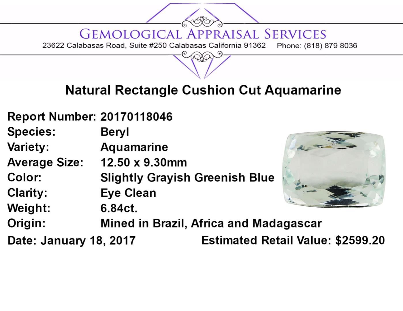 One natural rectangle cushion cut aquamarine with an exact weight of 6.84ct., clarity is eye clean, slightly grayish greenish blue. Gemological Appraisals Services estimates the retail value at $2599.2 GAS Appraised.