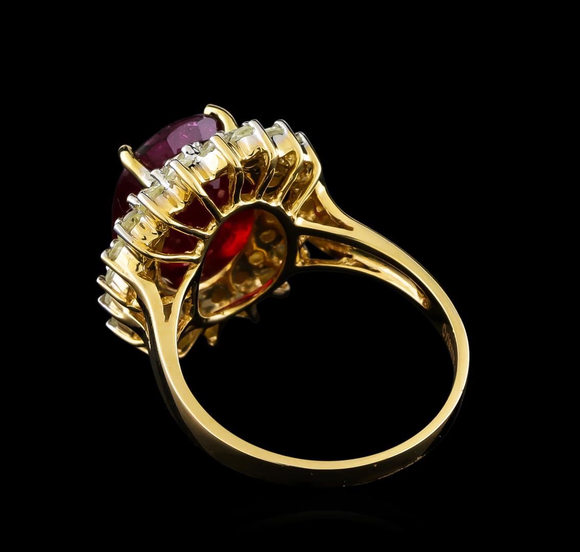 Fourteen karat (14K) yellow gold ruby and diamond ring. An oval cut ruby corundum gemstone is prong mounted in the center of the ring. Round brilliant cut diamonds accent the ring around the center gemstone. The ring is cast stamped "14k" and has a gross weight of 6.9 grams. Diamond(s): Shape: Round brilliant cut. Weight: 1.14 carat. Average clarity: I1-I2. Average color: H-J. Symmetry: Very good. Polish: Very Good. Gemstone(s): Gemstone: Ruby corundum. Nature: Natural. Shape: Oval, faceted. Quantity: 1, mounted. Weight: 6.85 carat. Dimensions: Length-12.83 mm. ; Width-8.89 mm. Bulge: Visible. Clarity: I1, type 3. Color: Red (5/5). Symmetry: Very good. Color intensity: Medium. Transparency: Transparent. Tone: Dark. Enhancements: Indications of high temperature heat treatment, with glass and flux additives. Metal(s): Metal: Gold, stamped. Purity: 14K. Color: Yellow. Condition: Excellent. Finish: High polish. GGA Appraised at $4,960.00.
