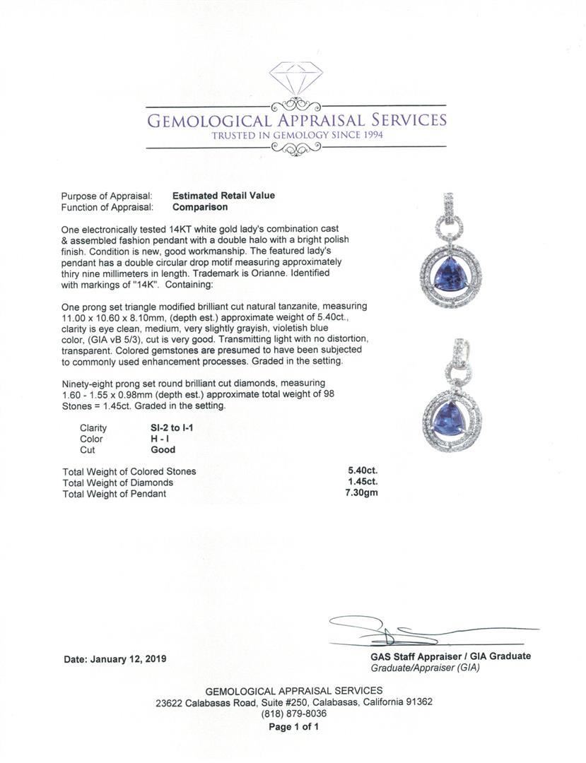 One electronically tested 14KT white gold lady's combination cast & assembled fashion pendant with a double halo with a bright polish finish. The featured lady's pendant has a double circular drop motif measuring approximately thiry nine millimeters in length. Trademark is Orianne. Identified with markings of '14K'. Condition is new, good workmanship. Containing: One prong set triangle modified brilliant cut natural tanzanite, measuring 11.00 x 10.60 x 8.10mm, (depth est.) approximate weight of 5.40 ct., clarity is eye clean, medium, very slightly grayish, violetish blue color, (GIA vB 5/3), cut is very good. Transmitting light with no distortion, transparent. Colored gemstones are presumed to have been subjected to commonly used enhancement processes. Graded in the setting. Ninety-Eight prong set round brilliant cut diamonds, measuring 1.60 - 1.55 x 0.98mm (depth est.) approximate total weight of 98 Stones = 1.45ct. Graded in the setting. Color H - I Clarity SI-2 to I-1 Cut Good. Total Weight of Colored Stones 5.40 ct.. Total Weight of Diamonds 1.45ct.. Total Weight of Pendant 7.30gm GAS Appraised at $9090.00. GAS Appraised.