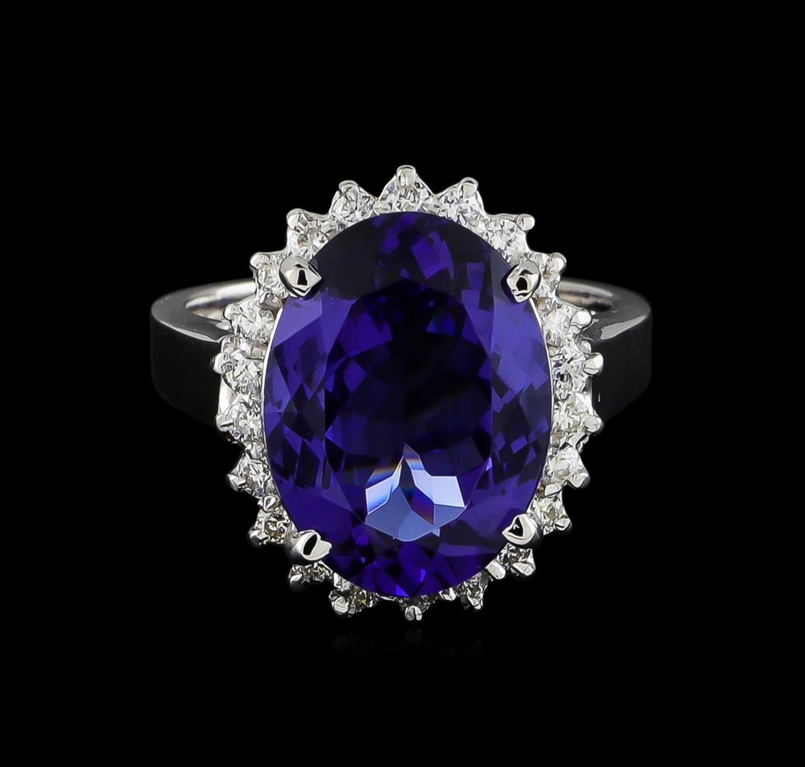 One electronically tested 14KT white gold ladies cast tanzanite and diamond ring with a bright polish finish. The featured tanzanite is set within a diamond floret supported by a ribbed under gallery, completed by a two and one-half millimeter wide band. Identified with markings of "14K". Condition is new, good workmanship. Containing: One prong set oval mixed cut natural tanzanite, measuring 14.85 x 10.90 x 5.90mm, 2%. bulge factor, approximate weight of 6.85ct., clarity is eye clean, type I, medium dark, moderately strong, bluish violet color, (GIA bV 6/4), cut is good. Transmitting light with no distortion, transparent. Colored Stone Grading Report attached. Graded in the setting. Tanzanite is a very rare gemstone that is only found in the country of Tanzania. Originally discovered in 1967. Tiffany & Company, named the stone Tanzanite. It is found in the Usumburu Mountains that border the Umba Valley of northern Tanzania. Tanzanite occurs in gray, brown, violet, blue, reddish-purple, & green. The gem is interesting because of its exceptional pleochroism. Rotated in different directions a tanzanite will exhibit multiple changes of color. Tanzanite has a low tolerance to ultrasonic cleaning, and should not be cleaned using this method. Twenty-Two prong set round brilliant cut diamonds, measuring 1.80 - 1.70 x 1.05mm (depth est.) approximate. Total Weight of 22 Stones = 0.43ct. Graded in the setting. Clarity: SI-2 to I-1. Color: F - H. Total Weight of Colored Stones 6.85ct. Total Weight of Diamonds 0.43ct. Total Weight of Ring 7.65gm. AIG Appraised at $17,830.00.