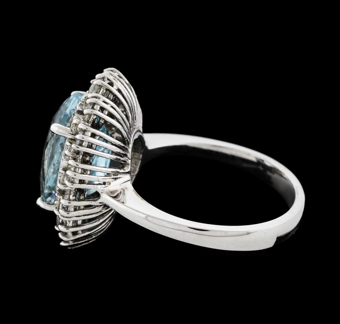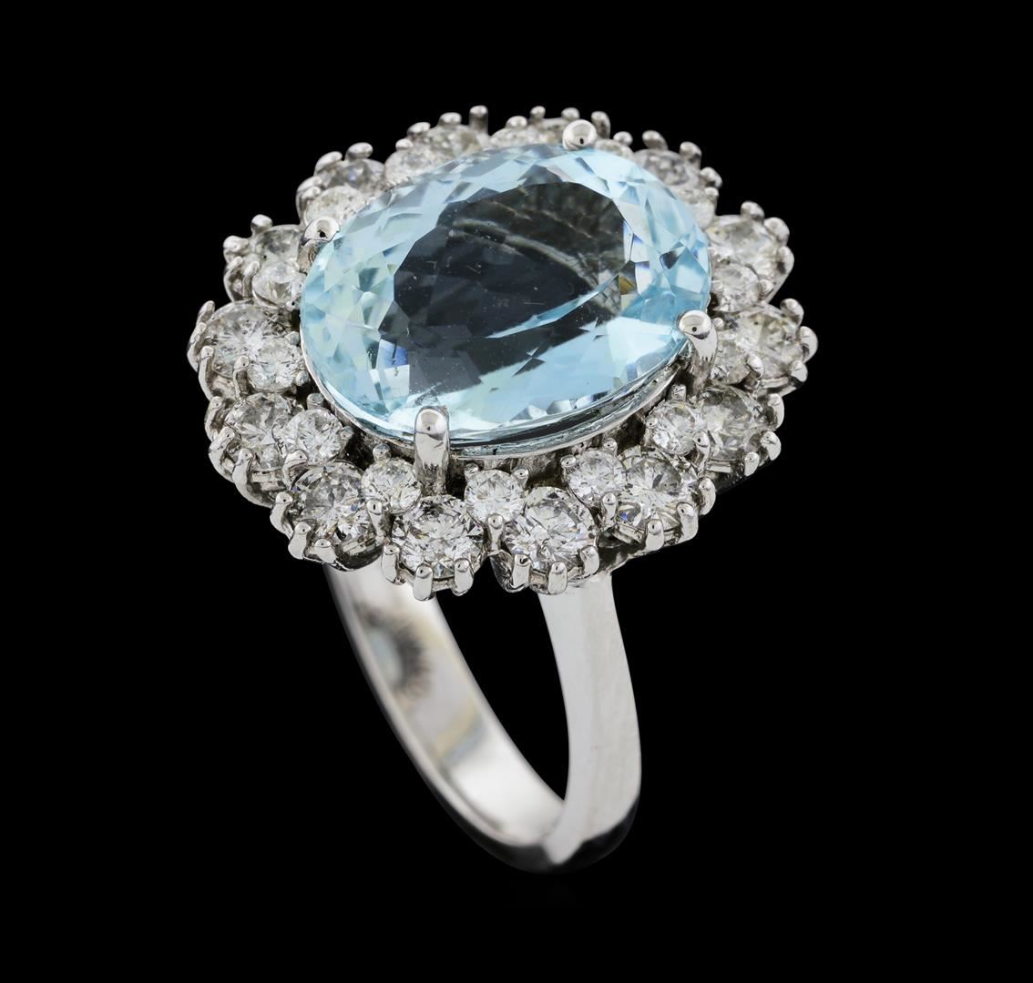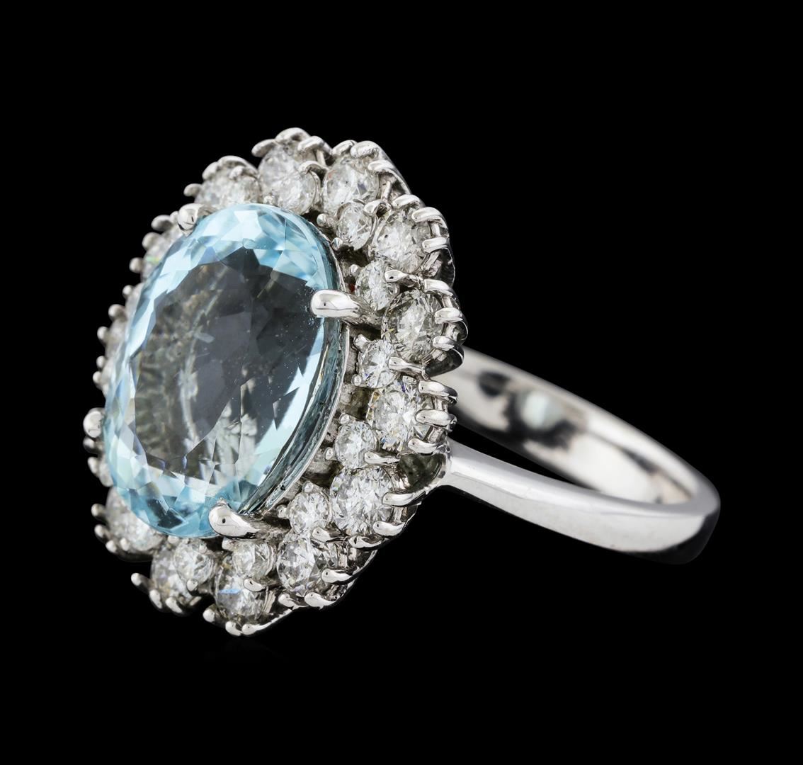 One electronically tested 14KT white gold lady's cast fashion ring with a staggered double basket halo with a bright polish finish. The featured lady's ring has a shank measuring 2.90 millimeters wide. Identified with markings of 'K14'. Condition is new, good workmanship. Containing: One prong set oval modified brilliant cut natural aquamarine, measuring 13.05 x 9.87 x 6.62mm, (depth est.) 10%. bulge factor, approximate weight of 6.86ct., clarity is slightly included, medium light, moderately strong, very slightly greenish blue color, (GIA vslgB 4/4), cut is good. Transmitting light with a minimum of distortion, transparent. Colored gemstones are presumed to have been subjected to commonly used enhancement processes. Graded in the setting. Fourteen prong set round brilliant cut diamonds, measuring 2.90 - 2.80 x 1.77mm (depth est.) approximate total weight of 14 Stones = 1.26ct. Graded in the setting. Clarity SI-1 to SI-2. Color: H - I Cut Good Fourteen prong set round brilliant cut diamonds, measuring 1.80 - 1.70 x 1.09mm (depth est.) approximate total weight of 14 Stones = 0.29ct. Graded in the setting. Clarity SI-1 to SI-2. Color: H - I Cut Good. Total Weight of Colored Stones 6.86ct.. Total Weight of Diamonds 1.55ct.. Total Weight of Ring 6.50gm. GAS Appraised at $9,980.00.