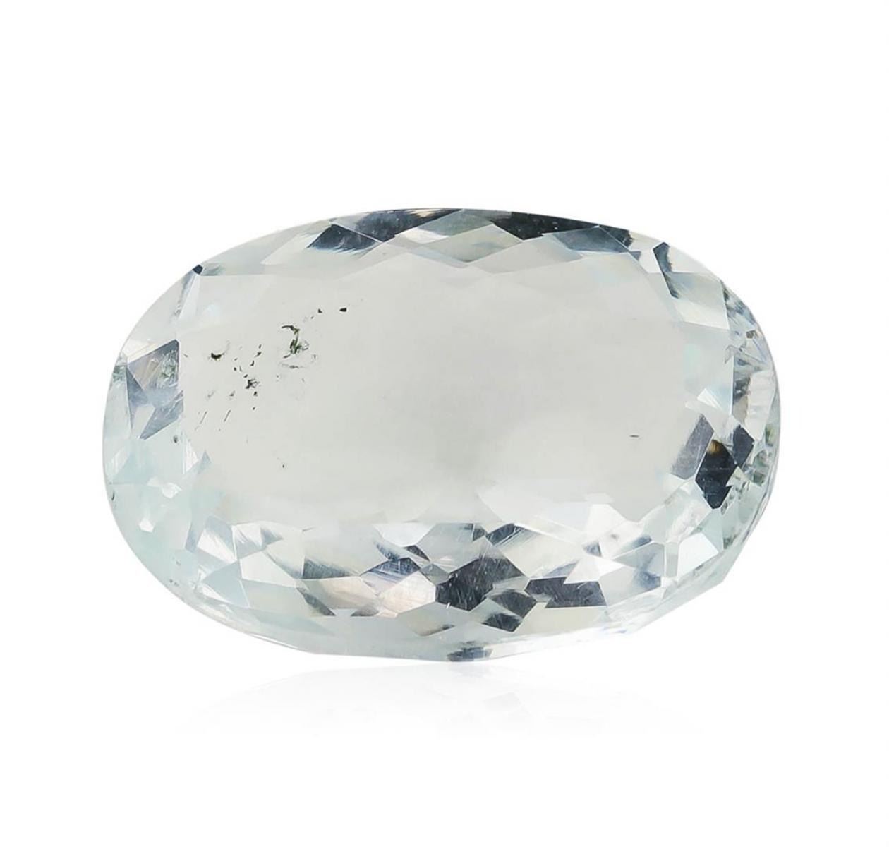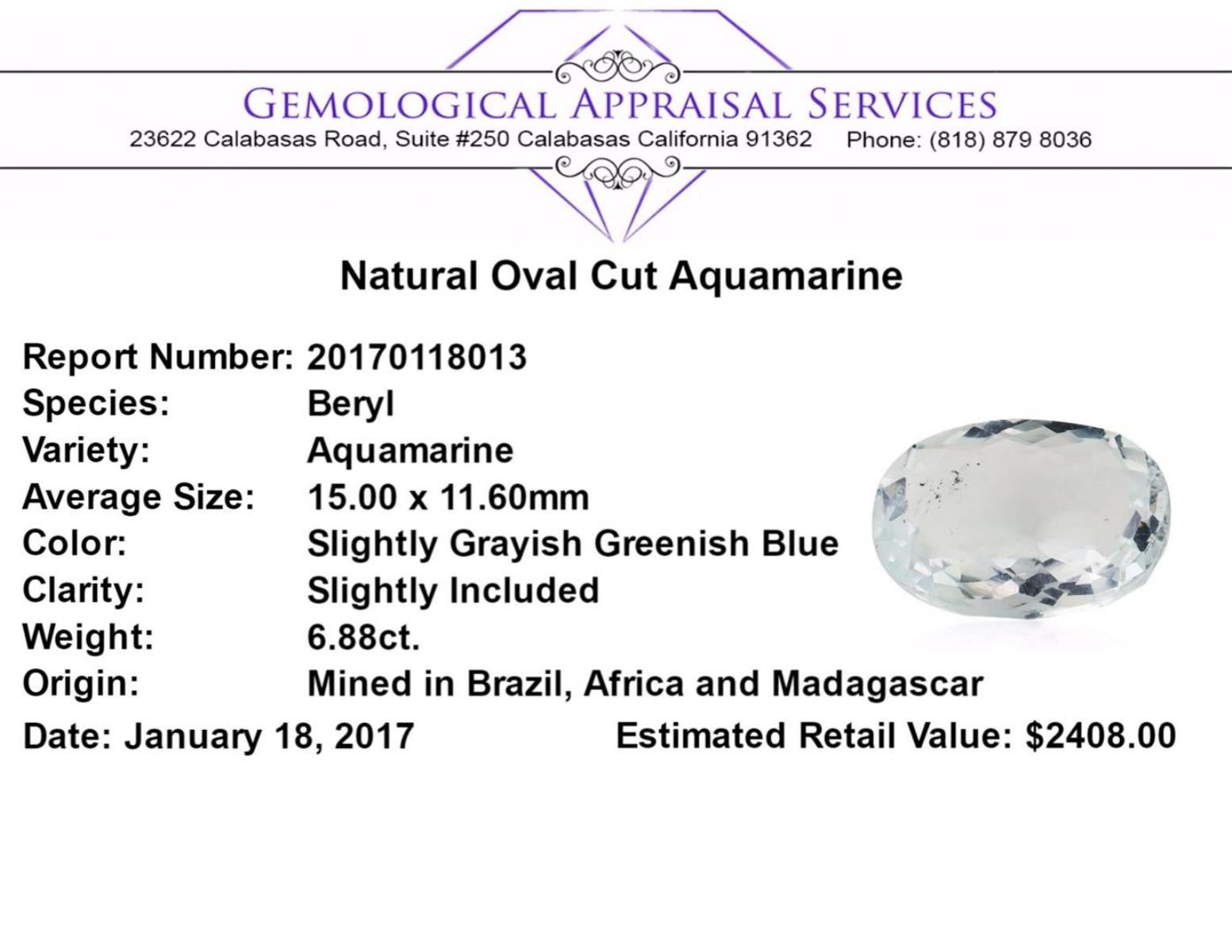 One natural oval cut aquamarine with an exact weight of 6.88ct., clarity is slightly included, slightly grayish greenish blue. Gemological Appraisals Services estimates the retail value at $2408 GAS Appraised.