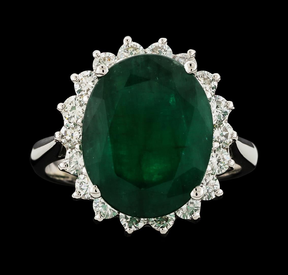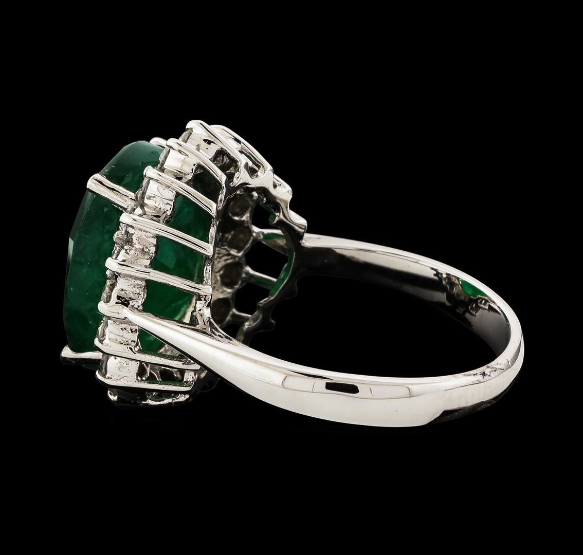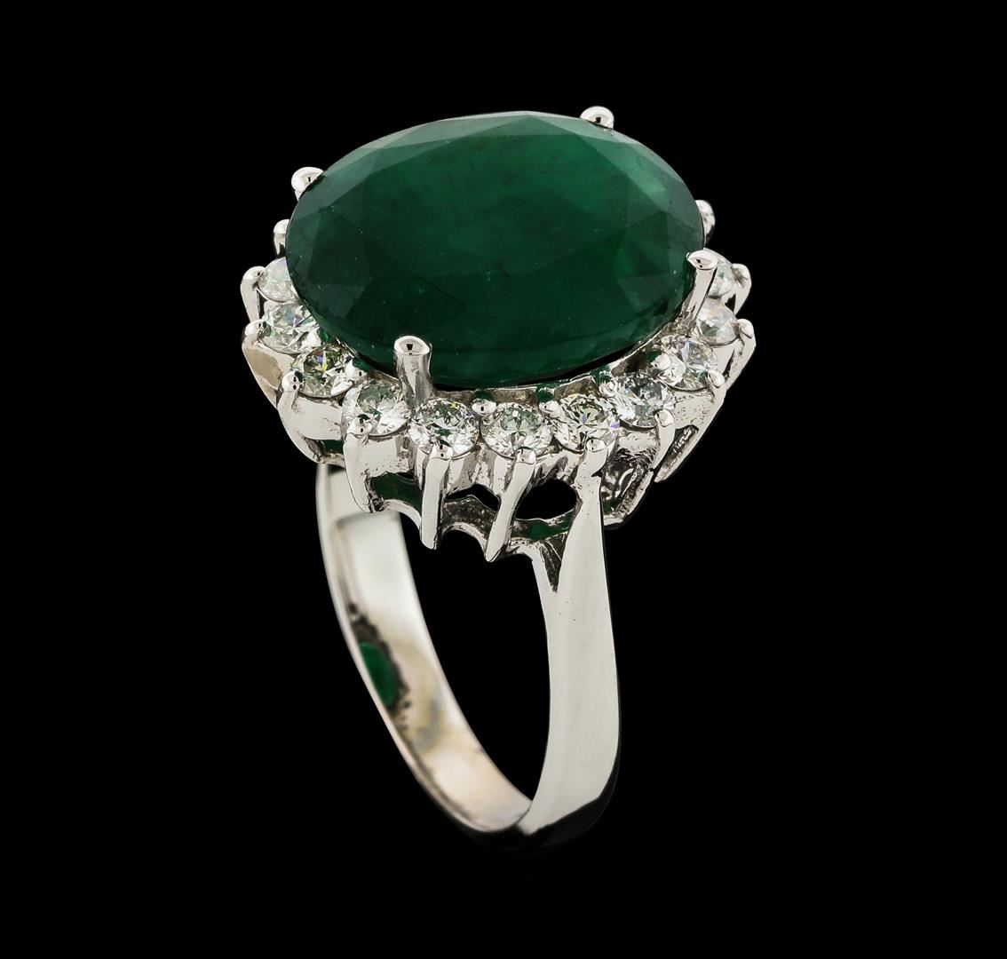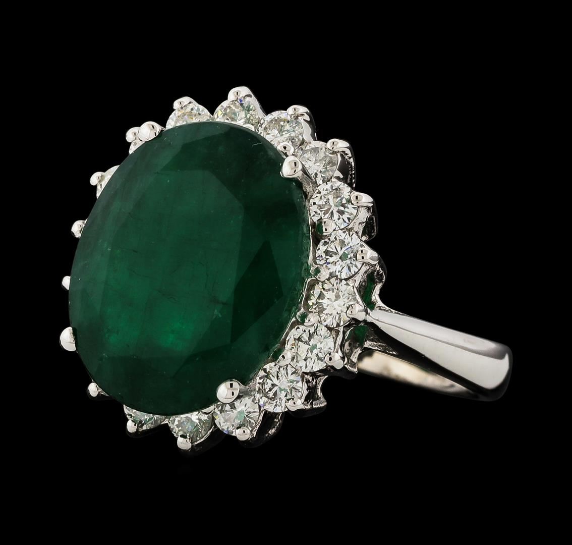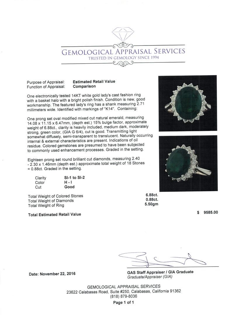 One electronically tested 14KT white gold lady's cast fashion ring with a basket halo with a bright polish finish. The featured lady's ring has a shank measuring 2.71 millimeters wide. Identified with markings of 'K14'. Condition is new, good workmanship. Containing: One prong set oval modified mixed cut natural emerald, measuring 14.08 x 11.15 x 6.47mm, (depth est.) 15%. bulge factor, approximate weight of 6.88ct., clarity is heavily included, medium dark, moderately strong, green color, (GIA G 6/4), cut is good. Transmitting light somewhat diffusely, semi-transparent to translucent. Naturally occurring internal & external characteristics are present. Indications of oil residue. Colored gemstones are presumed to have been subjected to commonly used enhancement processes. Graded in the setting. Eighteen prong set round brilliant cut diamonds, measuring 2.40 - 2.30 x 1.46mm (depth est.) approximate total weight of 18 Stones = 0.88ct. Graded in the setting. Clarity SI-1 to SI-2. Color: H - I Cut Good. Total Weight of Colored Stones 6.88ct.. Total Weight of Diamonds 0.88ct.. Total Weight of Ring 5.50gm. GAS Appraised at $9,585.00.